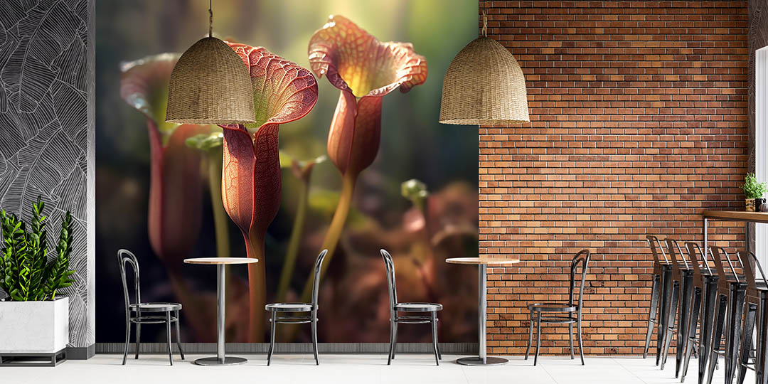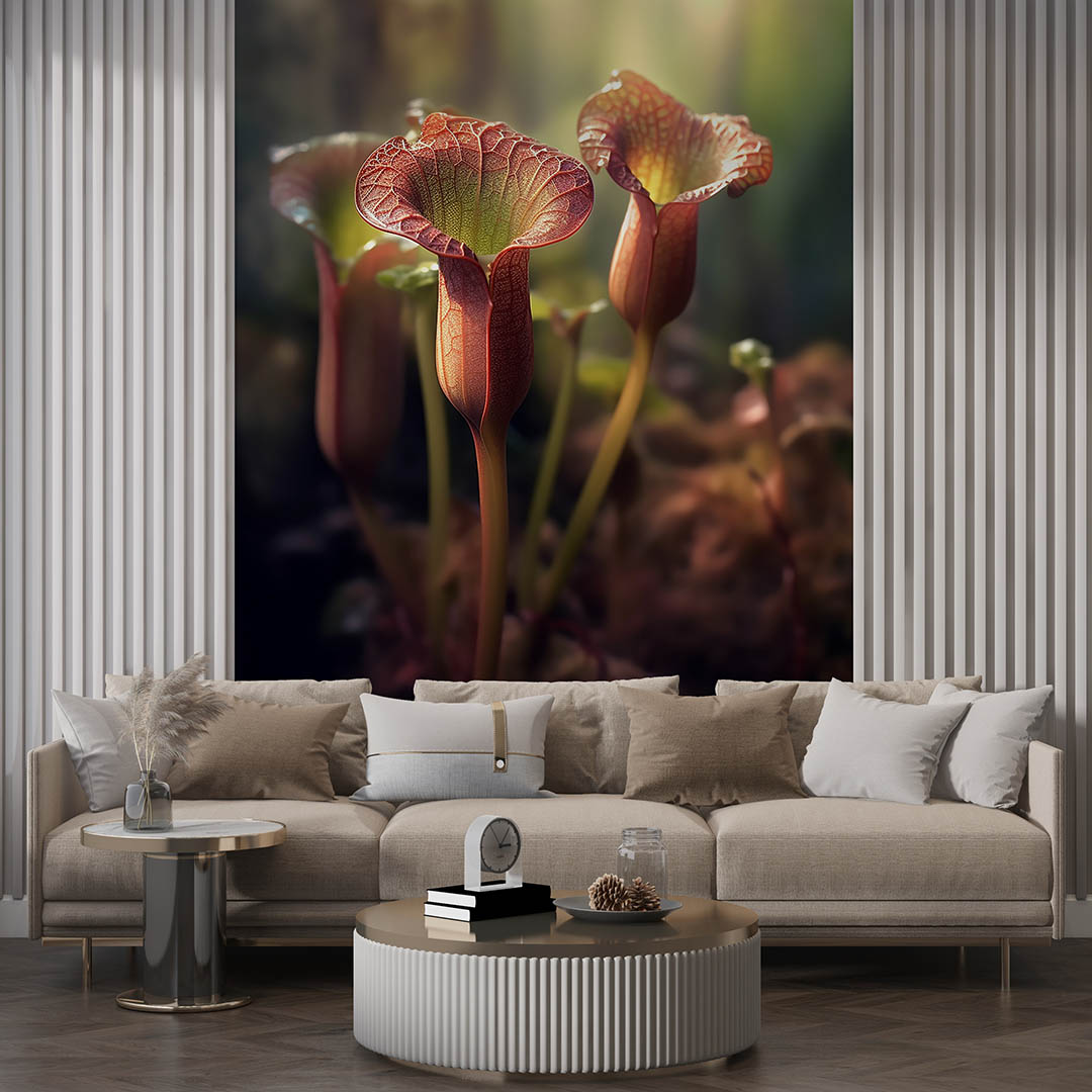 Bu tasarım, doğanın en ilginç ve gizemli yönlerinden birini gözler önüne seriyor: etobur bitkiler. Tropikal bir ormanın derinliklerinden ilham alınarak yaratılan bu eser, etobur bitkilerin büyüleyici güzelliğini ve tehlikeli cazibesini bir araya getiriyor. Canlı renkler ve detaylı dokular, bu bitkilerin hem çekiciliğini hem de avcı doğasını vurguluyor. Bu tasarım, mekanlara egzotik bir hava katarken, izleyicisine doğanın sıra dışı dünyasına bir bakış sunuyor.