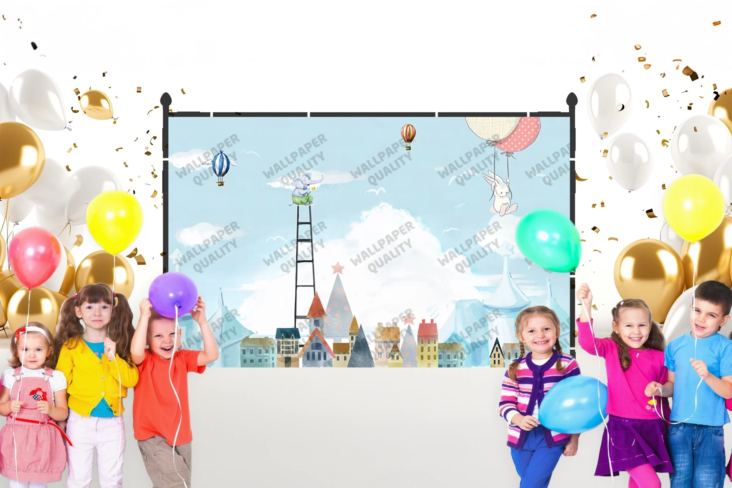 Bu tasarım, şirin ve stilize edilmiş bir şehrin üzerinde, gökyüzüne uzanan uzun bir merdivenin ve bu merdivende merakla bir çiçeği inceleyen sevimli bir filin fantastik bir sahnesini betimler. Sulu boyanın yumuşak dokusu ve pastel tonlardaki renk paleti, görselin dingin ve masalsı atmosferini oluşturur. Merdivenin ucunda bulutlara tutunmuş sallanan tavşan ve gökyüzündeki sıcak hava balonları, görselin rüya gibi ve fantastik atmosferini güçlendirir. Arka plandaki stilize edilmiş evler ve bulutlar, görselin masalsı derinliğini artırır. Bu görsel, çocukların hayal dünyasını besleyen, duvarlara asıldığında gülümseme yaratan bir sanat eseridir.