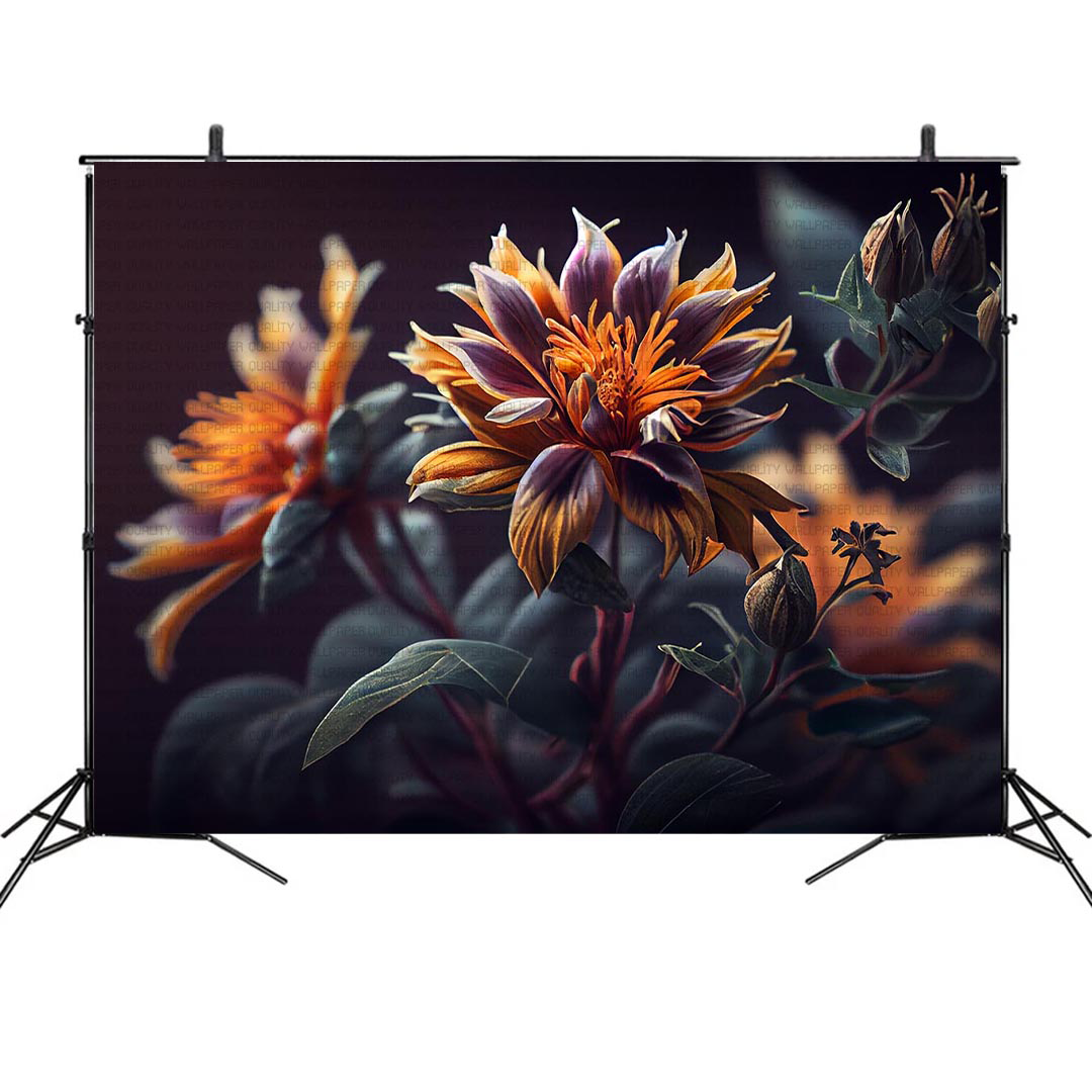 Bu görsel, gizemli bir bahçenin derinliklerinden gelen kadifemsi dokulu çiçeklerin büyüleyici güzelliğini yansıtıyor. Koyu renklerin hakim olduğu bu tasarımda, turuncu ve mor tonlardaki çiçekler gizemli bir zarafet sunuyor. Bu görsel, mekanlara sofistike bir hava, derinlik ve sanatsal bir dokunuş katıyor.