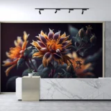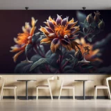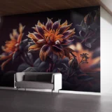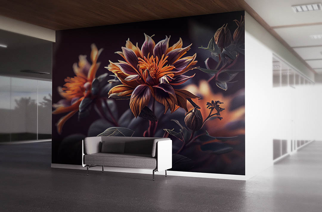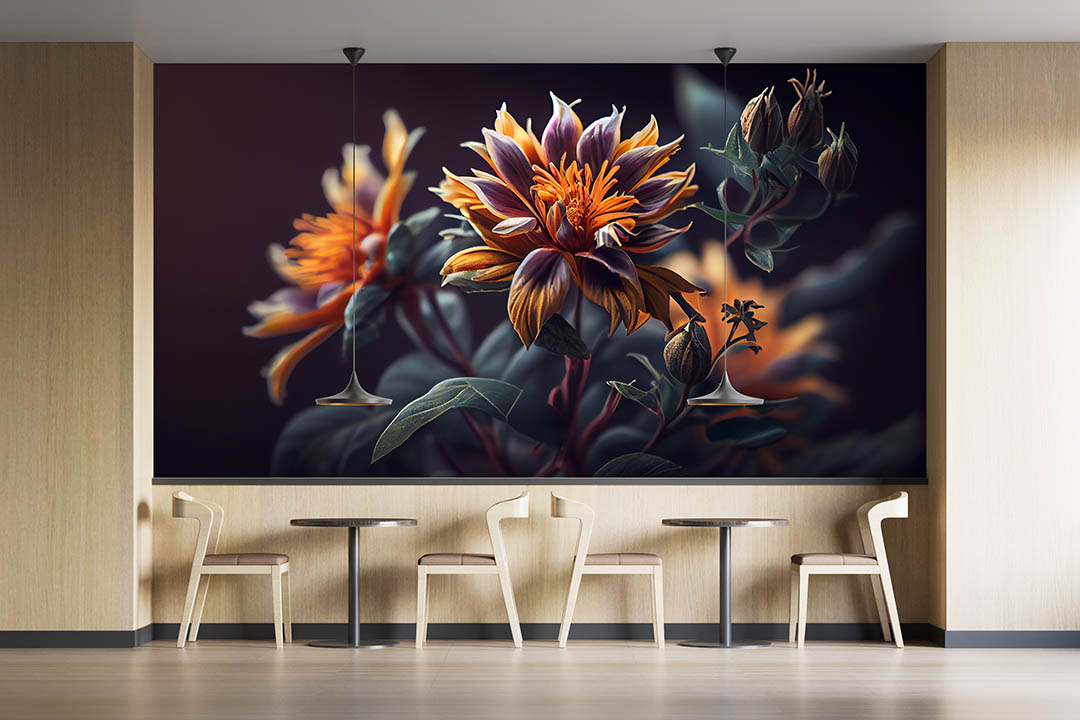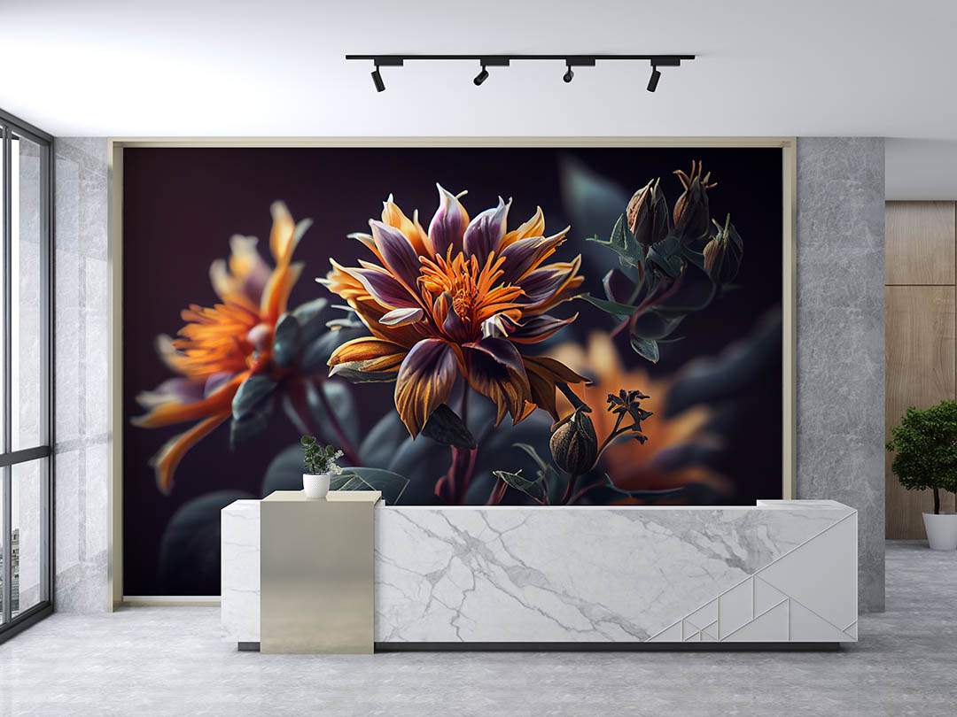 Bu görsel, gizemli bir bahçenin derinliklerinden gelen kadifemsi dokulu çiçeklerin büyüleyici güzelliğini yansıtıyor. Koyu renklerin hakim olduğu bu tasarımda, turuncu ve mor tonlardaki çiçekler gizemli bir zarafet sunuyor. Bu görsel, mekanlara sofistike bir hava, derinlik ve sanatsal bir dokunuş katıyor.