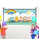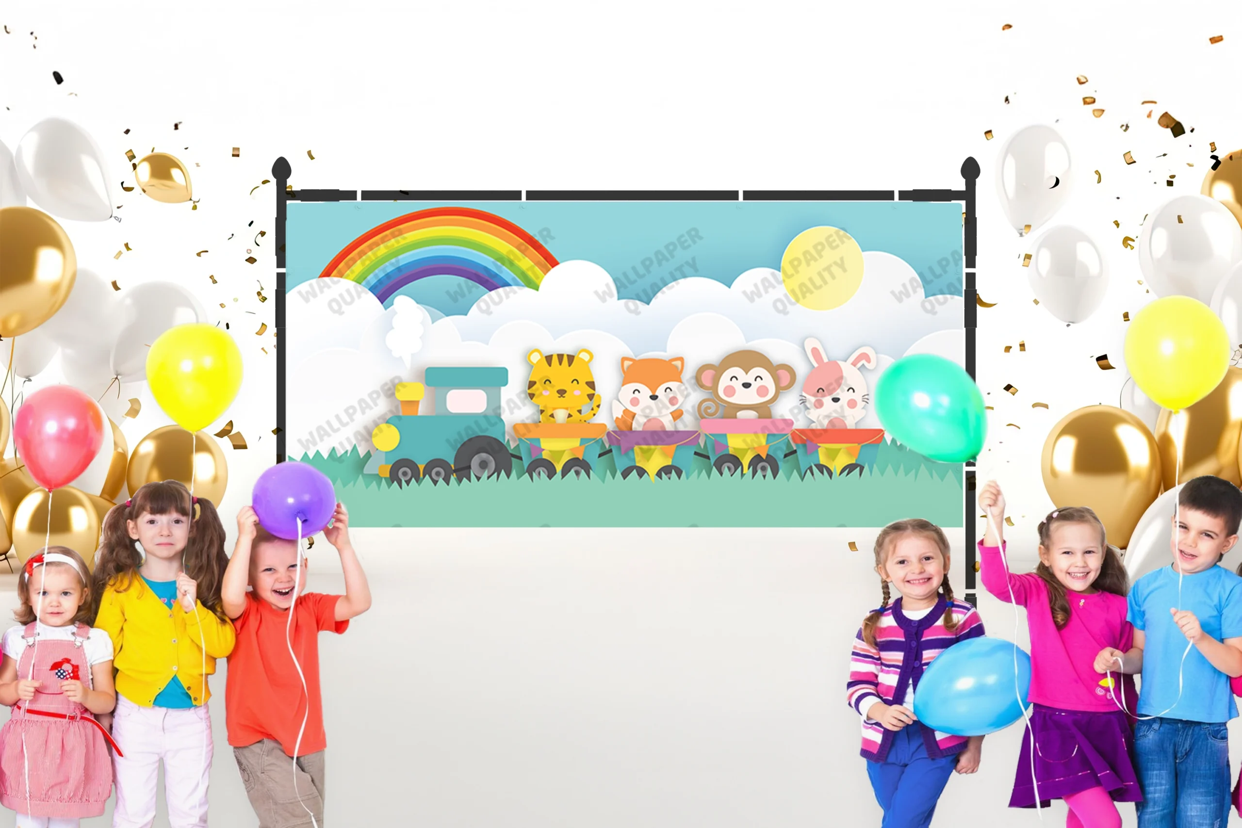 Bu sevimli görselde, neşeli hayvanlar gökkuşağının altında rengarenk bir trenle yolculuk ediyor. Parlayan güneş ve bulutlar, bu eğlenceli maceraya eşlik ediyor. Bu sahne, çocukların hayal gücünü harekete geçiren, onları renkli ve neşeli bir dünyaya davet eden sıcak ve davetkar bir atmosfer yaratıyor.