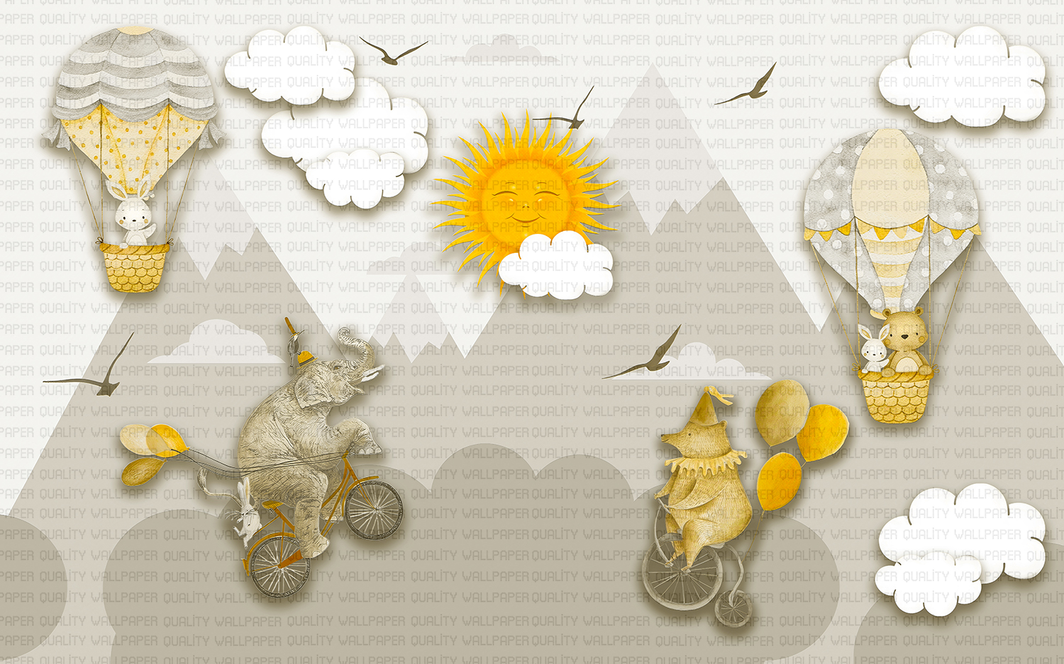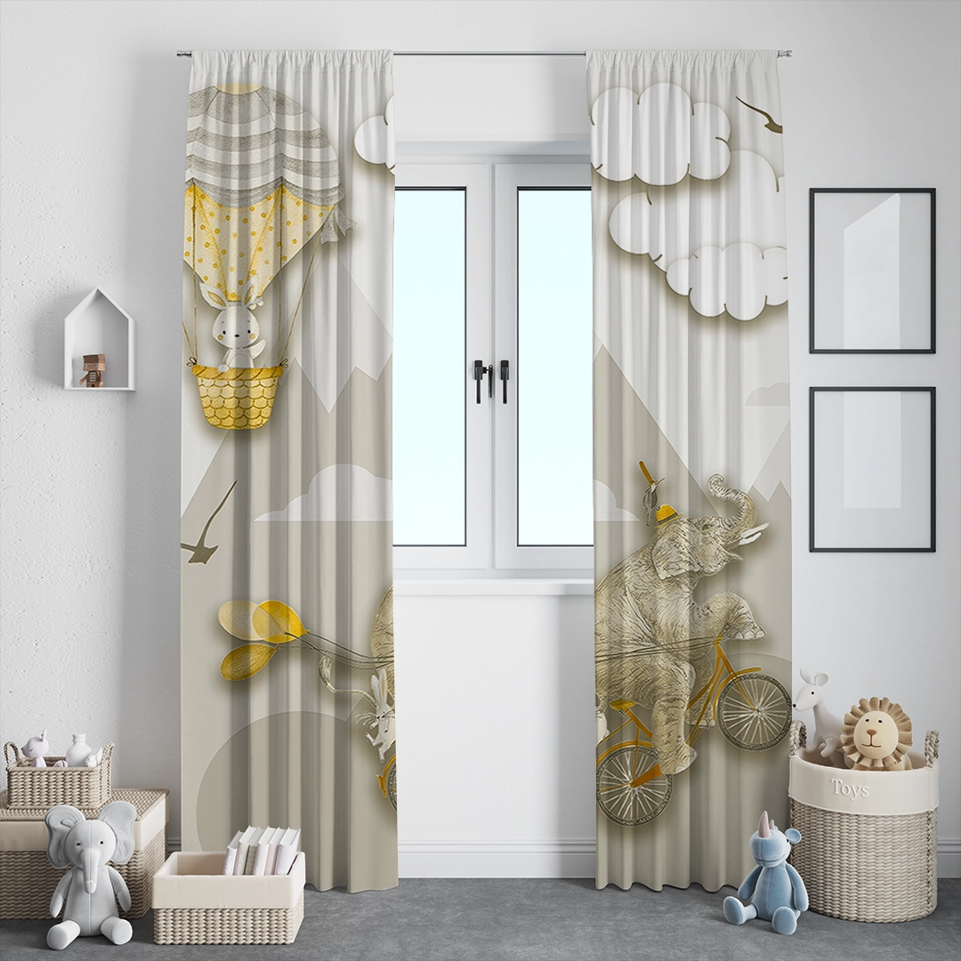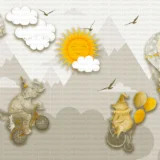 Bu tasarım, hayallerin ve neşenin sınır tanımadığı bir dünyayı betimler. Fırça darbeleri, pastel tonlarda bir gökyüzünü ve dağ manzarasını çizerken, bisiklet süren fil ve ayı figürleri sıra dışı bir maceranın başkahramanlarıdır. Uçan balonlar özgürlüğü ve hafifliği simgelerken, güneşin gülümsemesi ve uçuşan kuşlar mutluluğu ve umudu yansıtır. İzleyicide şaşkınlık, keyif ve “her şey mümkün” hissi uyandırır. Bu görsel, hayatın sıradanlığından sıyrılıp hayal gücünün kanatlarında yükselmeyi ve en beklenmedik dostlukların bile mümkün olduğunu hatırlatan bir hikaye anlatır.