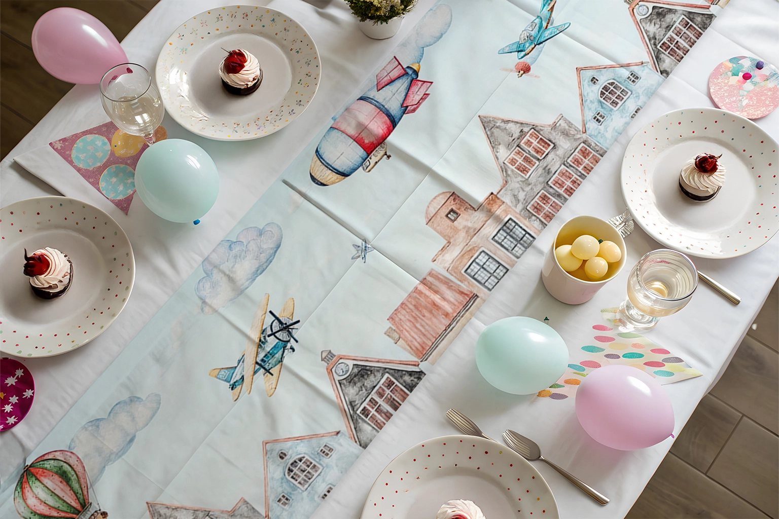 Bu tasarım, bir şehrin üzerinde süzülen uçan araçların masalsı görüntüsünü sunuyor. Balonlar ve uçaklar, şehrin tarihi dokusunu ve canlı atmosferini farklı bir perspektiften gözler önüne seriyor. Pastel renkler ve detaylı çizimler, izleyiciyi bu fantastik yolculuğa davet ediyor. Bu görsel, hayal gücünü harekete geçirerek şehri ve yolculuğu seven herkesi büyülü bir serüvene çıkarıyor.