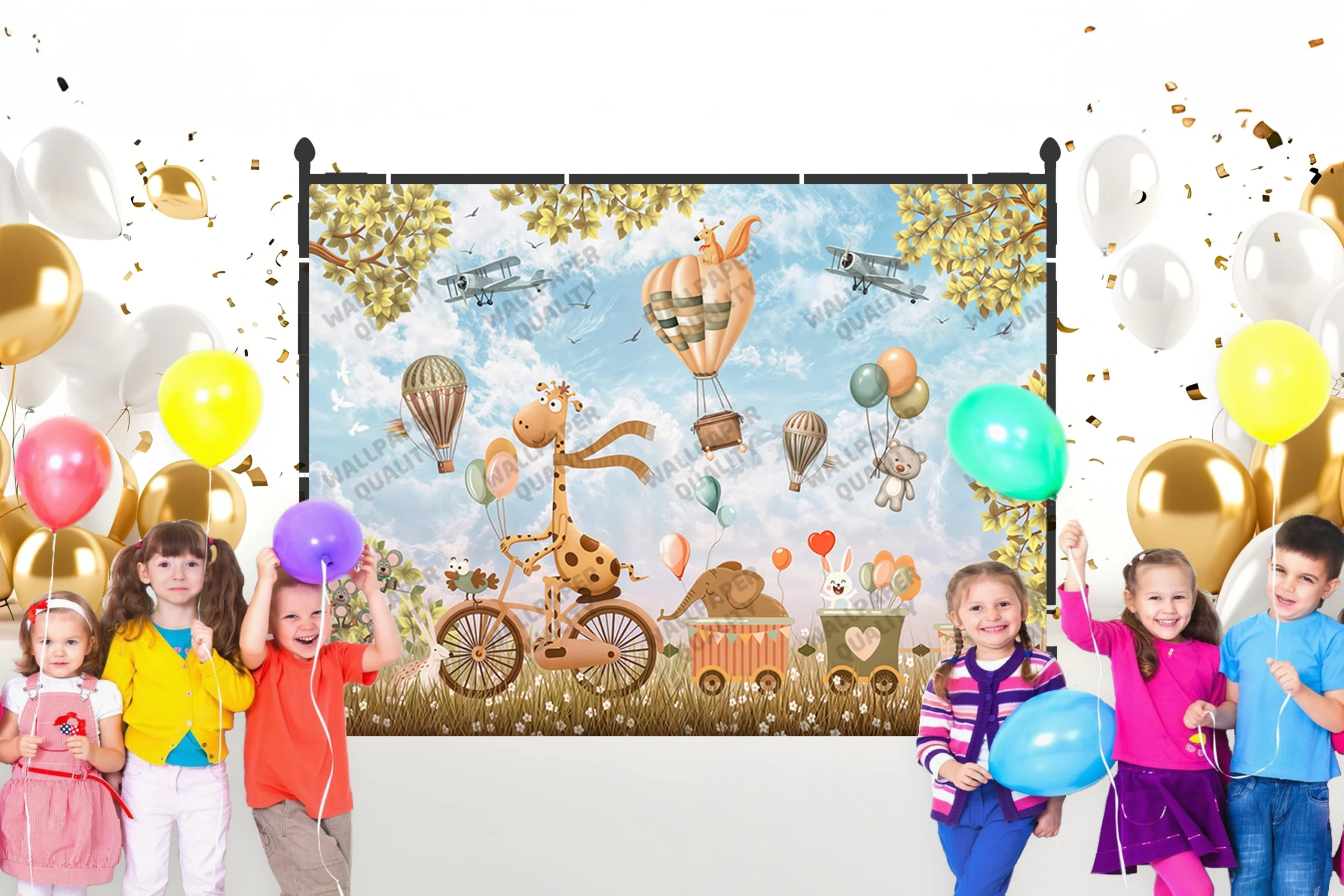 Be the first to review “Gökyüzünde Süzülen Balonlar ve Neşeli Dostlarla Dolu Hayaller Diyarı Fon Kumaş”