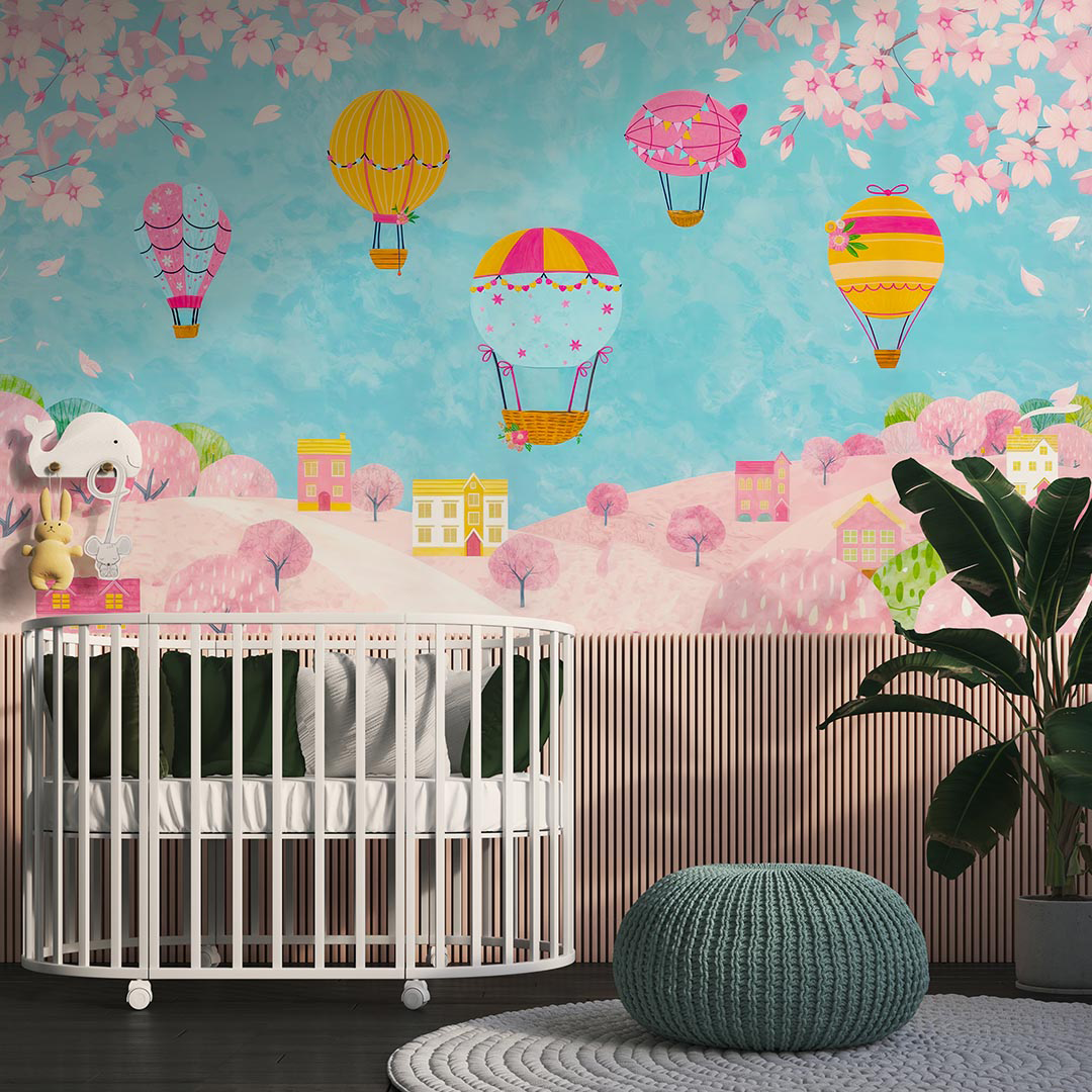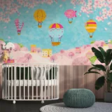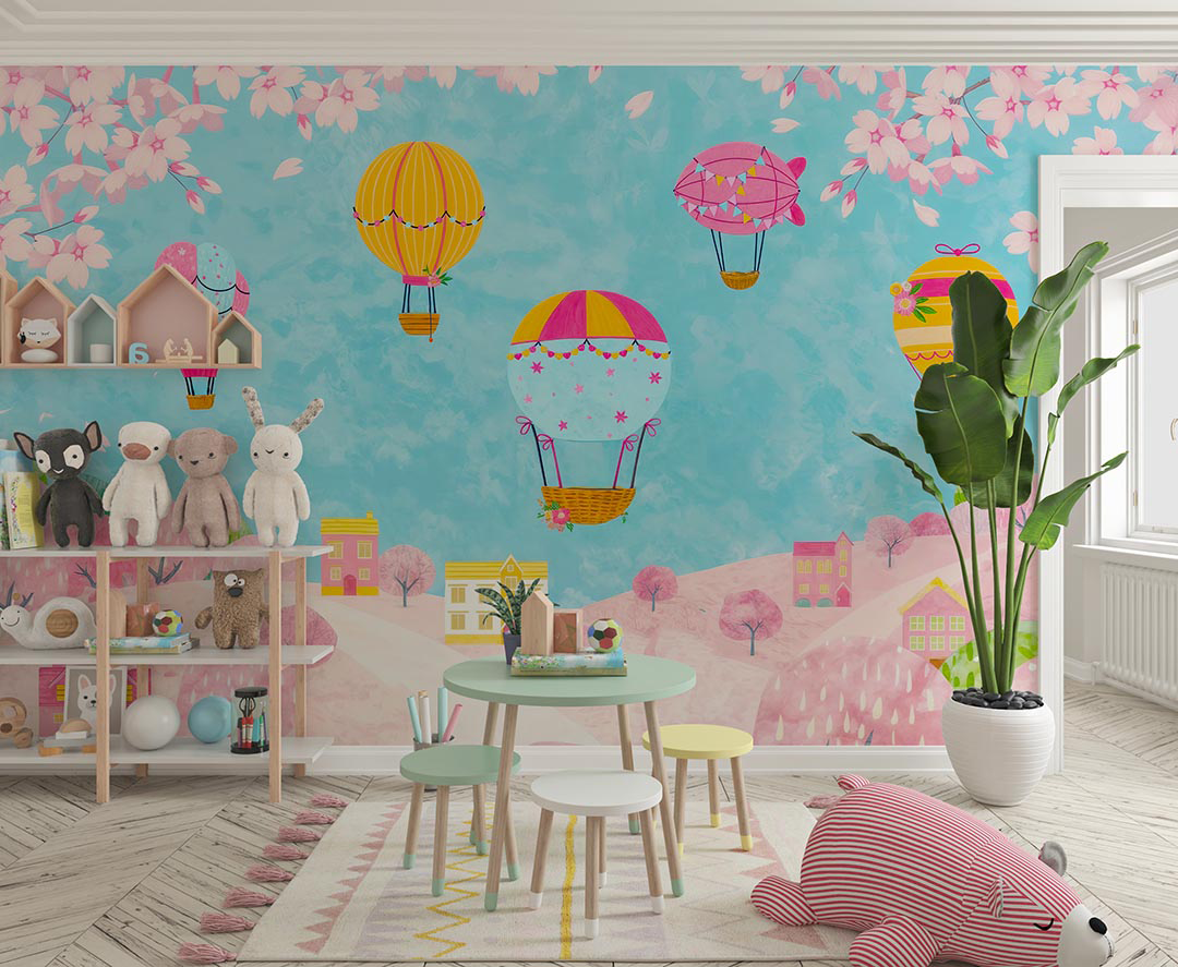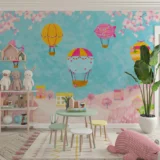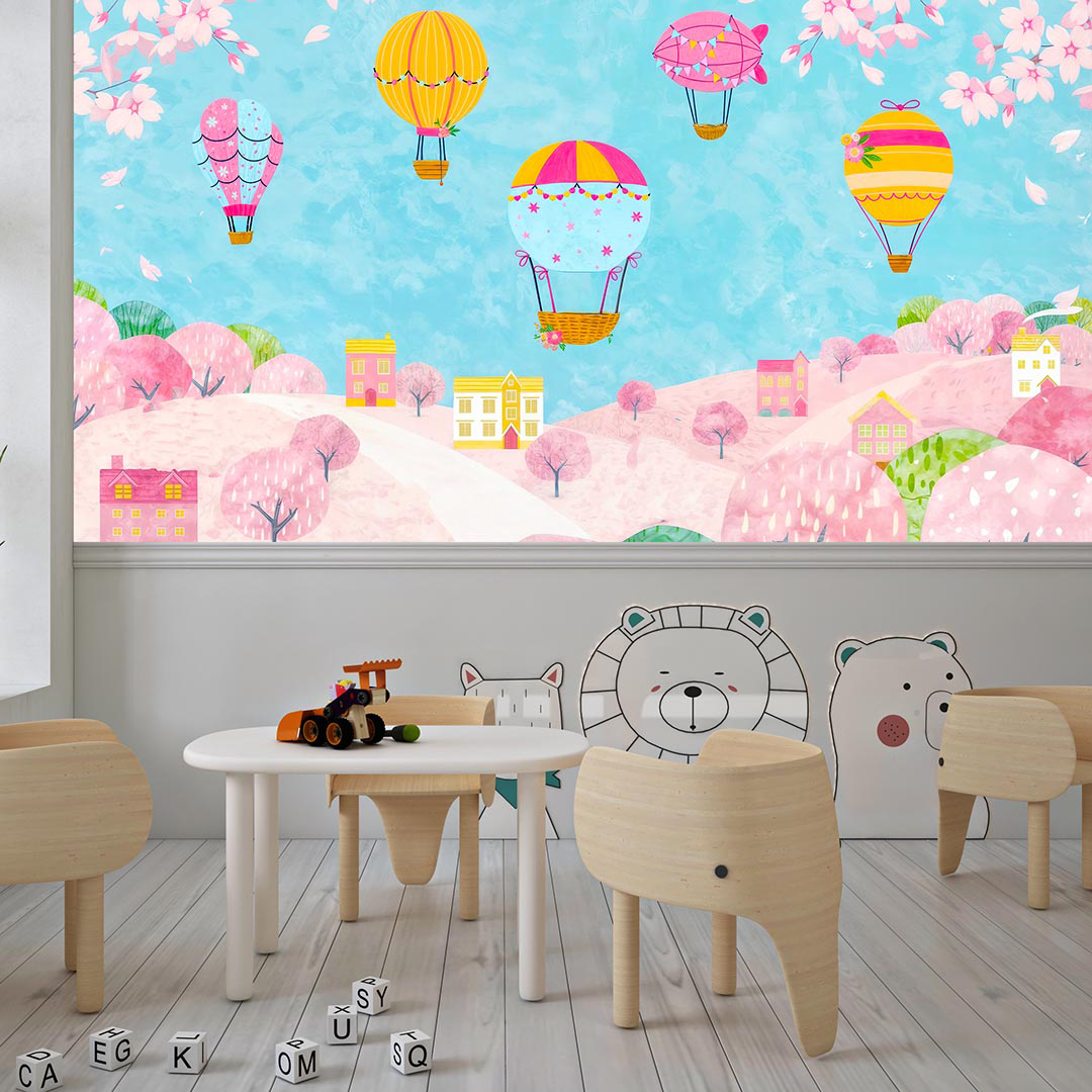 Bu büyüleyici görselde, sevimli bir köyün üzerinde rengarenk balonlar süzülüyor. Pastel tonlardaki evler ve ağaçlar, sıcak ve davetkar bir atmosfer yaratırken, gökyüzündeki balonlar tasarıma neşe ve hareketlilik katıyor. Bu masalsı sahne, çocukların hayal dünyasını zenginleştirerek onlara huzur ve mutluluk veriyor.