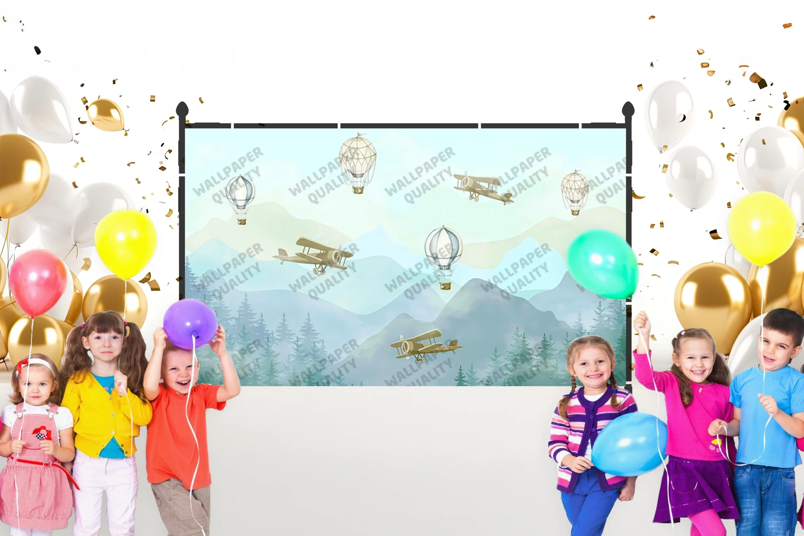 Bu tasarım, çocukların hayallerini süsleyen uçan araçları bir araya getiriyor. Gökyüzünde dans eden uçaklar ve balonlar, minik kaşifleri uzak diyarlara götürüyor. Pastel tonlar ve yumuşak çizgiler, huzurlu ve davetkar bir atmosfer yaratırken, macera duygusunu da canlı tutuyor. Bu görsel, çocukların hayal güçlerini harekete geçirerek onlara keşif ve özgürlük dolu bir dünya sunuyor.