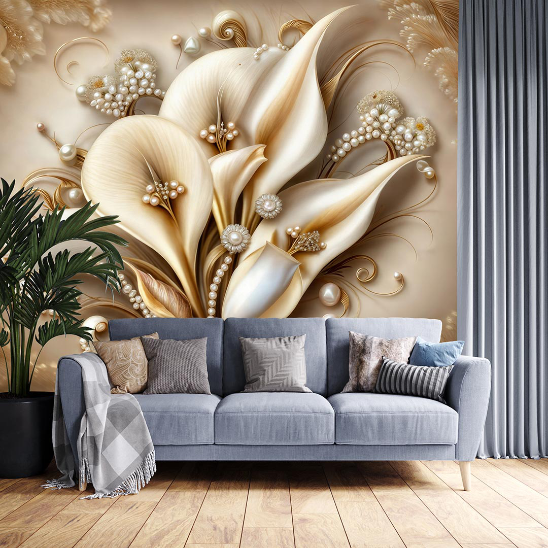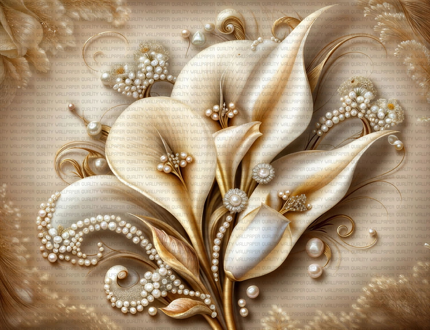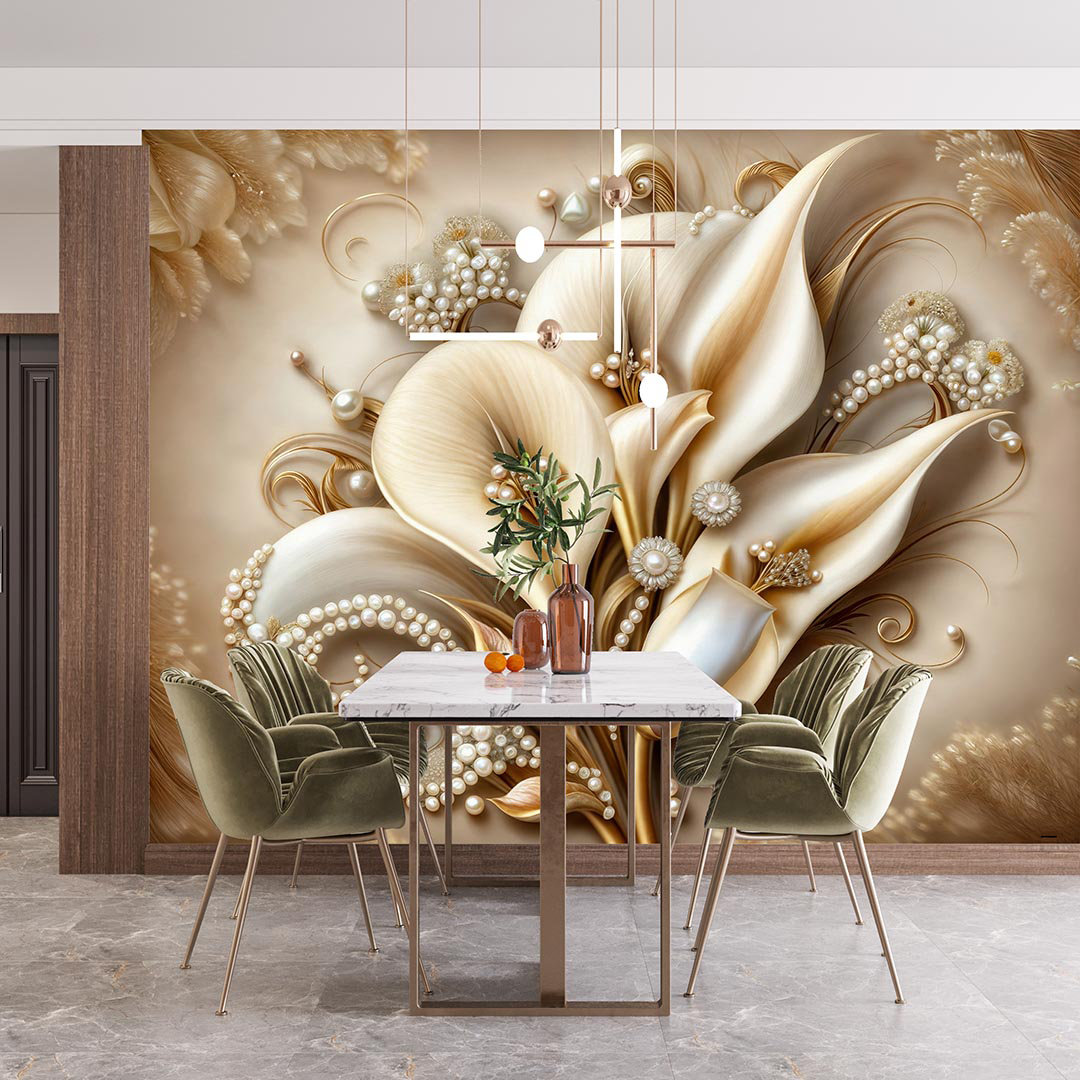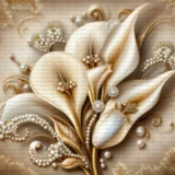 Bu büyüleyici tasarım, incilerin zarif ışıltısını ve çiçeklerin büyüleyici güzelliğini bir araya getiriyor. Krem tonlarındaki çiçekler, incilerle süslenerek lüks ve sofistike bir görünüm kazanıyor. Altın detaylar, tasarıma zenginlik ve ihtişam katıyor. İzleyiciye zarafet, lüks ve romantizm hissini yaşatıyor.