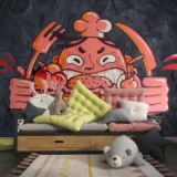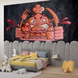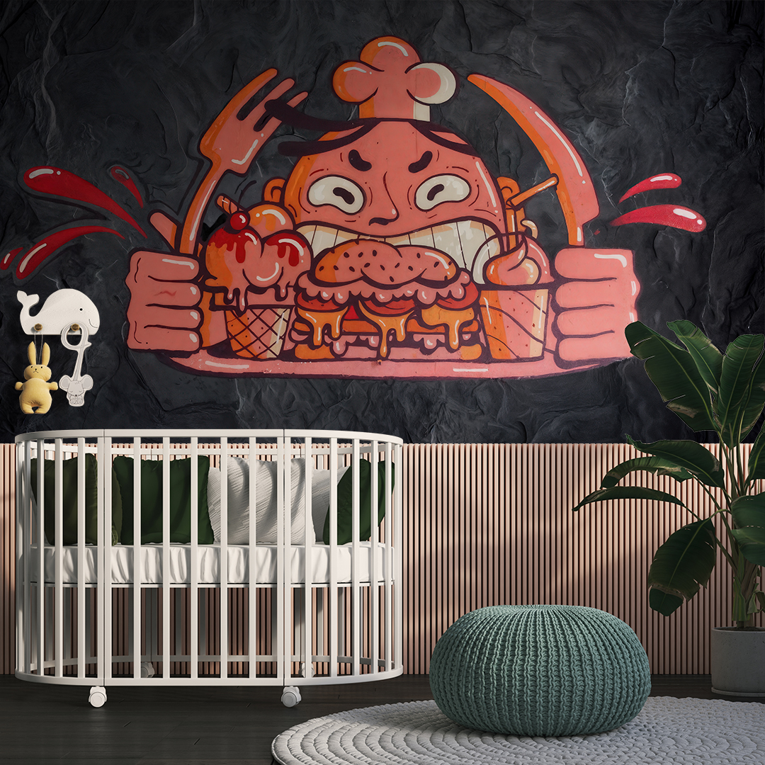 Bu tasarım, aşçının yemek yapma tutkusunu ve aynı zamanda duyduğu yoğun açlığı mizahi ve abartılı bir dille ifade ediyor. Büyük gözler, belirgin dişler ve etrafındaki yiyecekler, karakterin yemeğe olan düşkünlüğünü ve belki de yaratıcı açlığını simgeliyor. Fırça darbeleri ve canlı renkler, enerjik ve dikkat çekici bir atmosfer yaratır. Bu görsel, yemek kültürüne, aşçılığa veya sadece ilginç ve esprili tasarımlara ilgi duyanlar için idealdir. Odanıza astığınızda, sohbet başlatıcı olacak ve yüzlerde bir gülümseme oluşturacaktır.