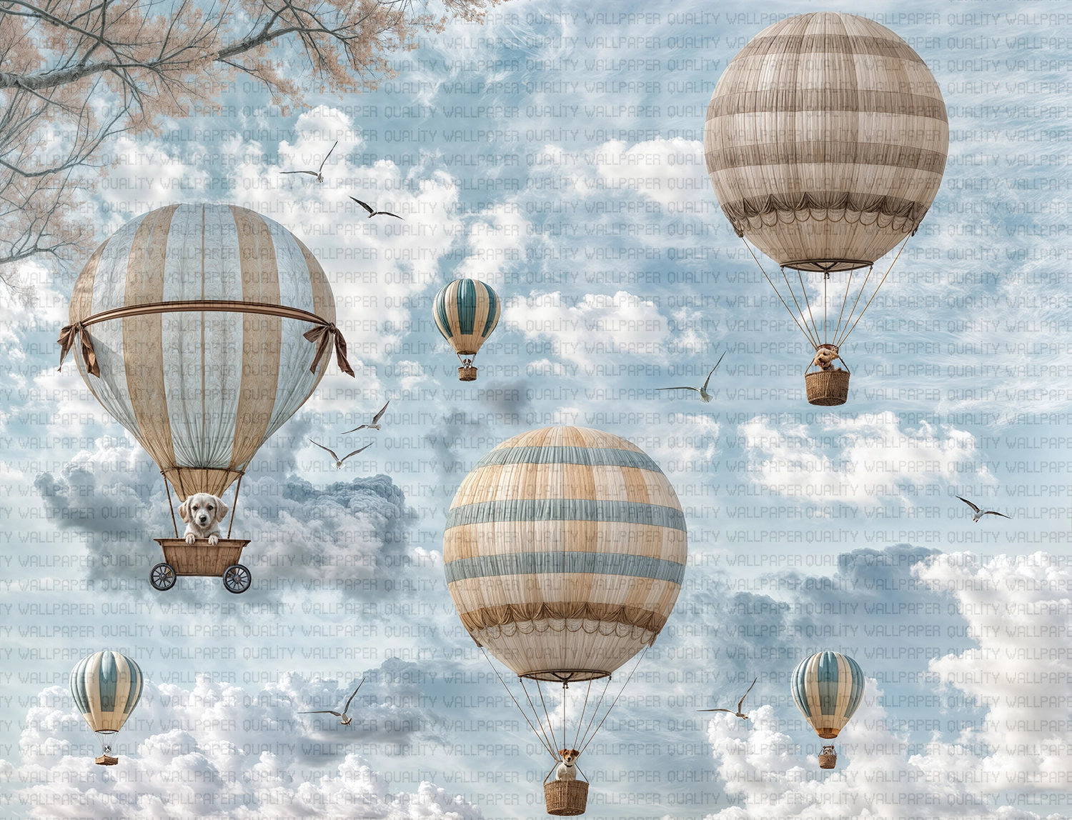 Bu tasarım, gökyüzünün sınırsız özgürlüğünü ve hayallerin peşinden gitme arzusunu bir araya getiriyor. Her bir sıcak hava balonu, pastel tonlardaki çizgileri ve zarif detaylarıyla, bulutların üzerinde süzülen birer rüya gibi. Balonların sepetlerinde yer alan sevimli köpekler, bu büyülü yolculuğa neşe ve masumiyet katıyor. Bulutlar, kuşlar ve hafifçe görünen ağaç dalları, izleyicide hafiflik, dinginlik, ilham ve maceraya dair bir uyanış hissi uyandırıyor. Bu görsel, hayatın güzelliklerini keşfetmeye, her zaman daha yükseklere ulaşmaya ve içimizdeki çocuksu ruhu canlı tutmaya teşvik eden bir çağrıdır. Her bakışta yeni bir maceraya davet eder, ruhu dinlendirir ve içsel bir huzur sunar.