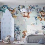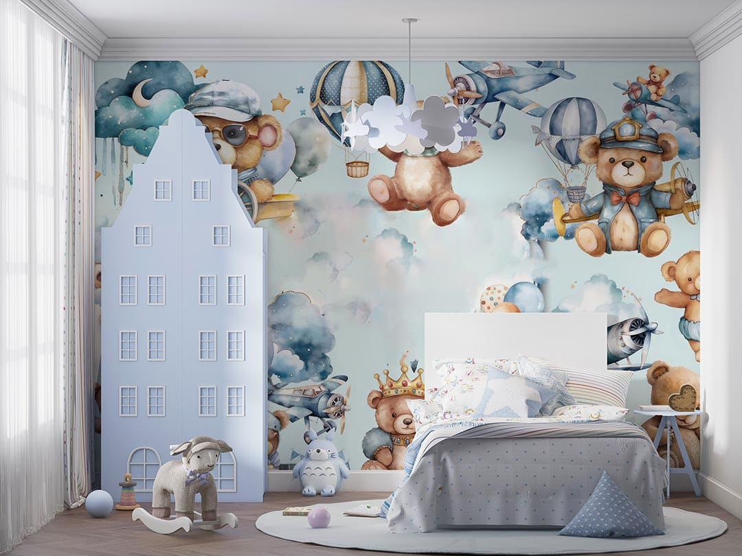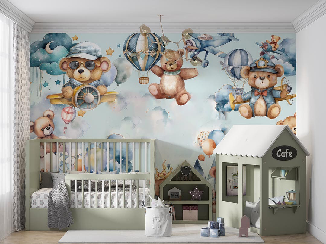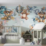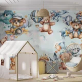 Bu sevimli görselde, rengarenk balonlar ve uçaklarla süslenmiş bir gökyüzünde neşeli ayıcıklar resmediliyor. Her bir ayıcık, farklı bir maceranın peşinde; kimi pilot, kimi yolcu, kimi de sadece bu keyifli yolculuğun tadını çıkarıyor. Yumuşak renkler ve sevimli detaylar, izleyiciye huzurlu ve eğlenceli bir dünya sunuyor. Bu eser, çocuksu hayallerin, arkadaşlığın ve keşfetme arzusunun bir kutlamasıdır. İzleyicisine sıcak bir gülümseme ve tatlı bir anımsama hissi veriyor.
