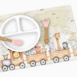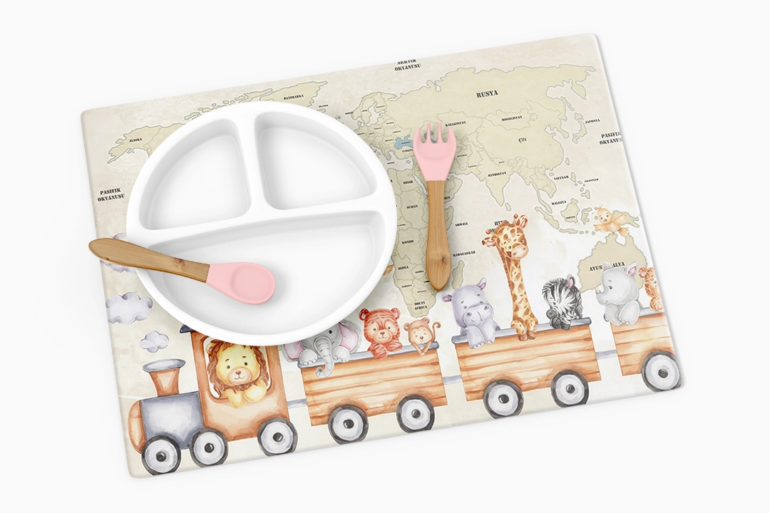 Bu sevimli görsel, bir tren vagonunda yolculuk eden hayvan dostlarımızı dünya haritası zemininde bir araya getiriyor. Aslan, fil, zürafa ve diğer sevimli hayvanlar, çocuklara hem dünyayı tanıtıyor hem de onlara keyifli bir yolculuk yaşatıyor. Renklerin canlılığı ve hayvanların neşeli ifadeleri, bu sahneye sıcaklık ve eğlence katıyor.