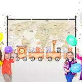 Bu sevimli görsel, bir tren vagonunda yolculuk eden hayvan dostlarımızı dünya haritası zemininde bir araya getiriyor. Aslan, fil, zürafa ve diğer sevimli hayvanlar, çocuklara hem dünyayı tanıtıyor hem de onlara keyifli bir yolculuk yaşatıyor. Renklerin canlılığı ve hayvanların neşeli ifadeleri, bu sahneye sıcaklık ve eğlence katıyor.