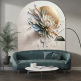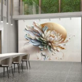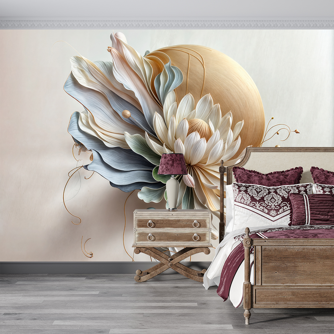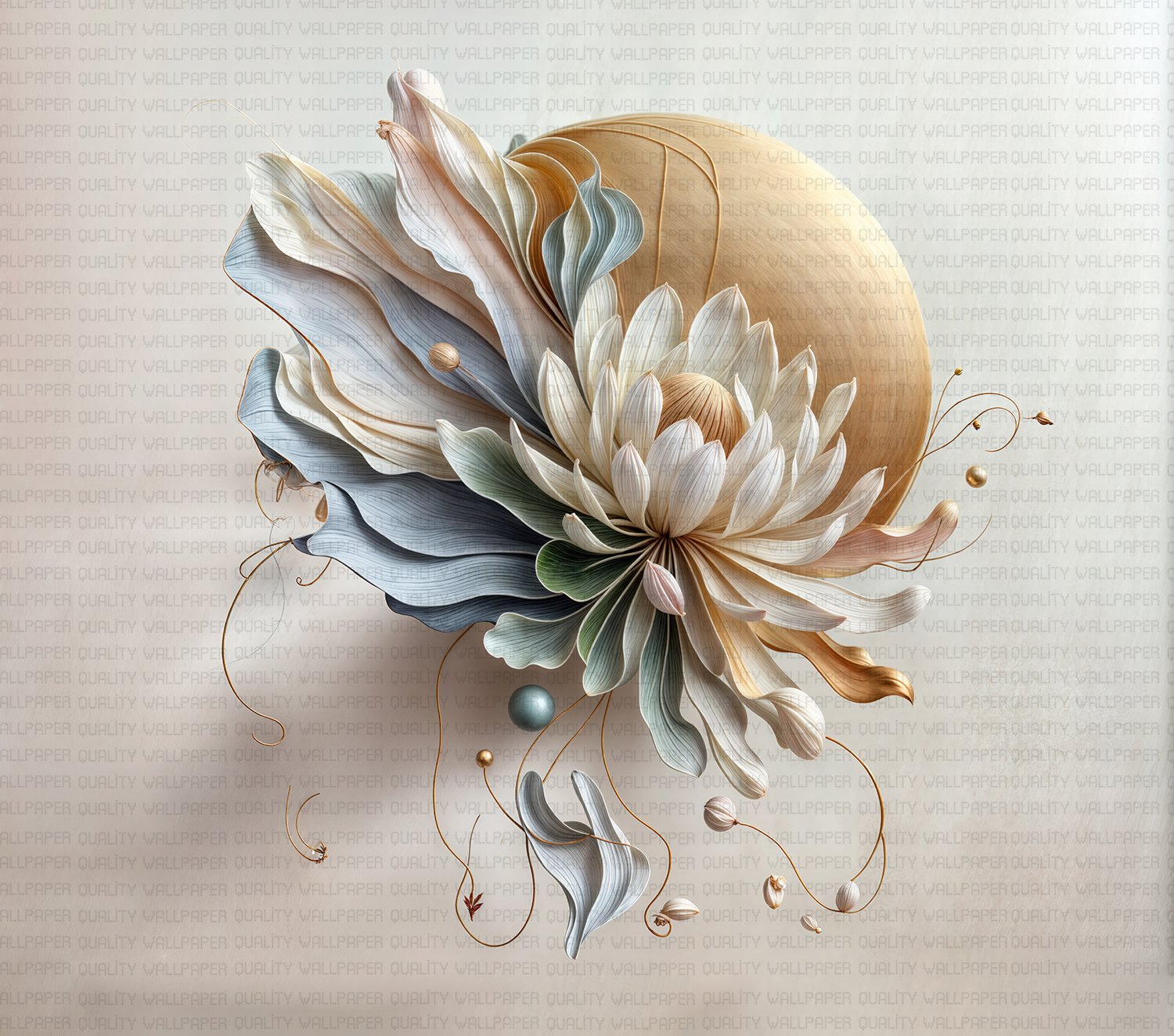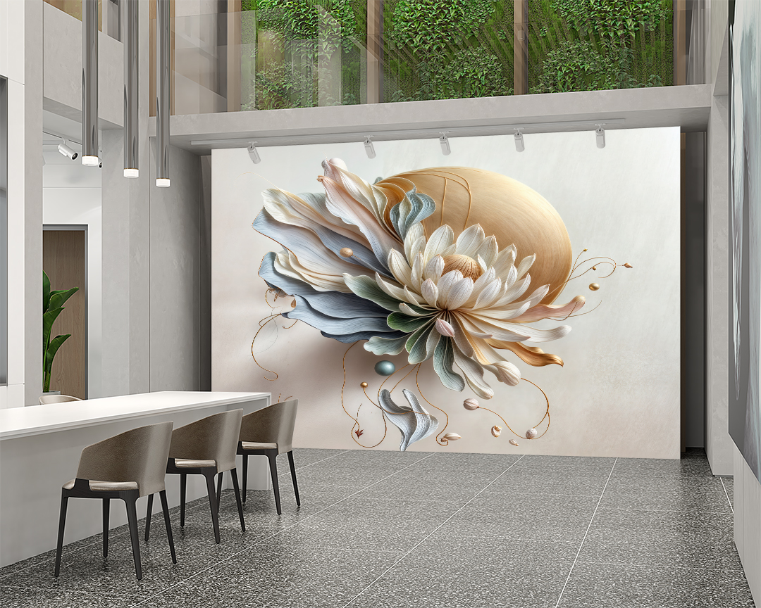 Bu tasarım, lotus çiçeğinin saf ve büyüleyici güzelliğini inci ışıltısının zarif dokunuşuyla bir araya getiriyor. Lotus çiçeğinin her bir yaprağı, inci tanelerinin yumuşak parıltısıyla aydınlanıyor, ortaya çıkan görüntü ise hem göz alıcı hem de huzur verici. Bu kompozisyon, mekanlara dinginlik, zarafet ve mistik bir hava katarken, inci detayları tasarıma sofistike bir dokunuş ekliyor.