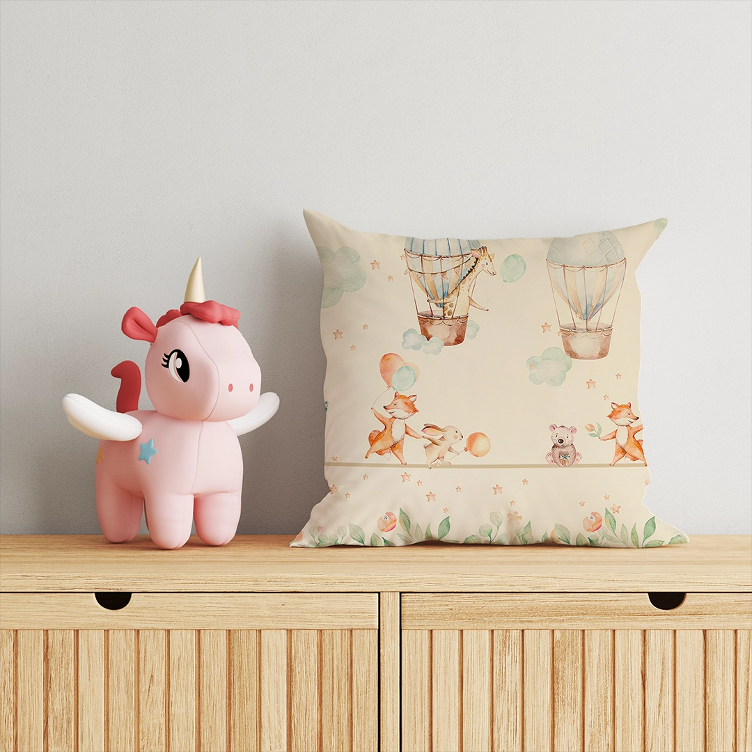 Bu tasarımda, sevimli hayvanlar bir ip üzerinde neşeyle sıralanmış, rengarenk balonlar ve bulutlarla süslenmiş bir atmosferde betimleniyor. Fırça darbeleriyle oluşturulan yumuşak dokular ve pastel tonlar, izleyende sıcaklık ve mutluluk hissi uyandırıyor. Bu sevimli kompozisyon, çocukların hayal gücünü harekete geçirerek onlara eğlenceli bir dünya sunuyor.