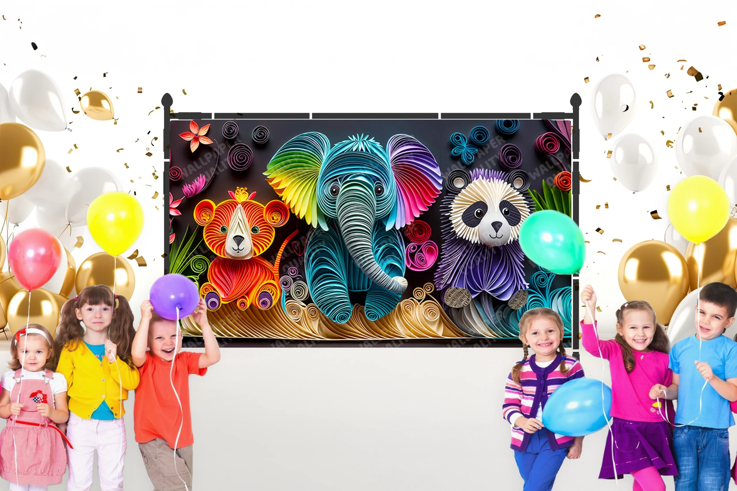 Bu tasarım, kağıt kıvırma (quilling) sanatının büyüleyici dünyasını kullanarak oluşturulmuş, canlı ve dokulu bir hayvan portresi sunar. Renklerin cesur ve parlak kullanımı, görselin enerjik ve neşeli atmosferini güçlendirir. Filin heybeti, ayının sevimliliği ve pandanın ikonik görünümü, kağıt şeritlerin özenle kıvrılmasıyla elde edilen 3D doku sayesinde hayat bulur. Her bir kıvrım ve renk geçişi, sanatçının emeğini ve yaratıcılığını yansıtır. Bu görsel, el sanatlarına ilgi duyanlar ve yaşam alanlarına özgün ve renkli bir dokunuş katmak isteyenler için bir ilham kaynağıdır.