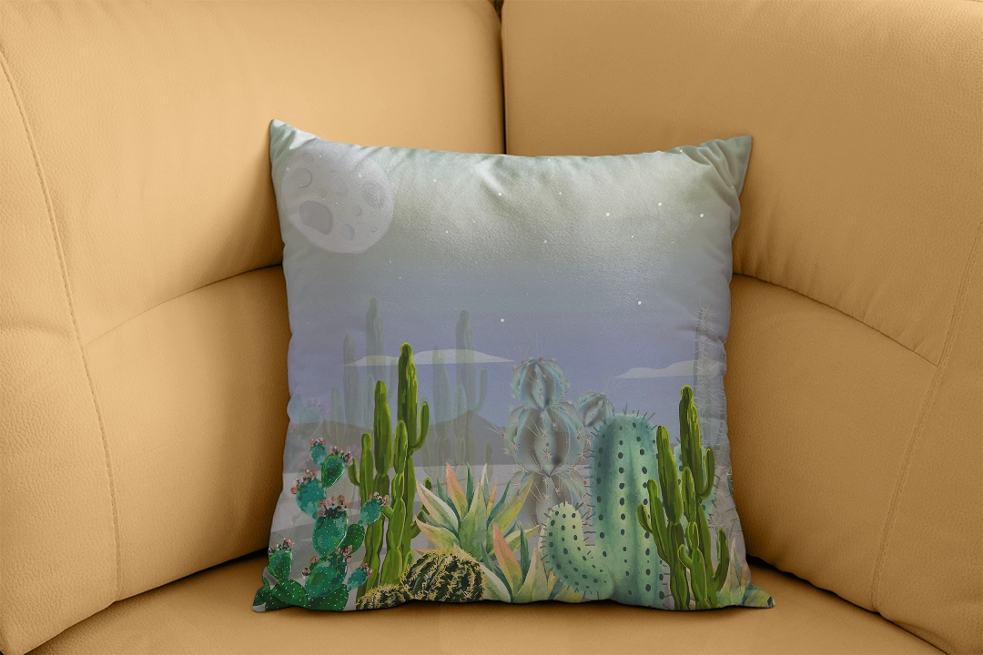 • Kırlent: Koltuk veya yatakta kullanıldığında, tropik kaktüslerin geceleyin desenlerini yaşam alanınıza taşır. Dekorasyona mistik bir dokunuş ve konfor katar.