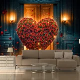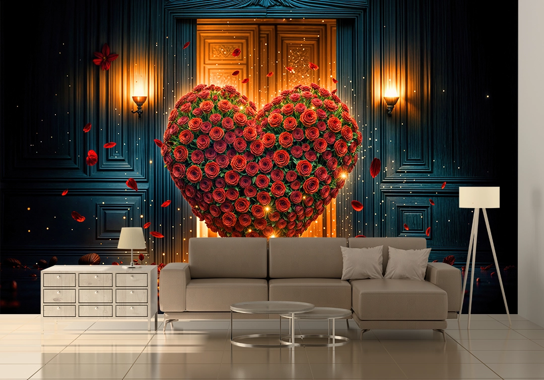 Bu tasarım, aşkın en saf ve en tutkulu halini, adeta bir rüyadan fırlamış gibi gözler önüne seriyor. Koyu renkli, klasik bir odanın ortasında yükselen, binlerce canlı kırmızı gülden oluşmuş devasa bir kalp, sevginin gücünü ve derinliğini simgeliyor. Kalbin etrafına ve yere serpilmiş ışıltılı tanecikler, bu özel anın büyülü atmosferini tamamlarken, arka plandaki sıcak ışıklar ve zarif kapı, umudu ve yeni başlangıçları fısıldıyor. Her bir fırça darbesi, güllerin kadifemsi dokusunu, ışıkların parıltısını ve bu anın dinginliğini hissettirirken, renklerin uyumu izleyicide hem huzur hem de derin bir romantizm hissi uyandırır. Bu eser, bakan herkese kendi özel anlarını hatırlatacak, mekanlara sıcaklık, gizem ve zamansız bir güzellik katacak, adeta bir rüyadan fırlamış gibi büyülü bir his bırakacaktır.