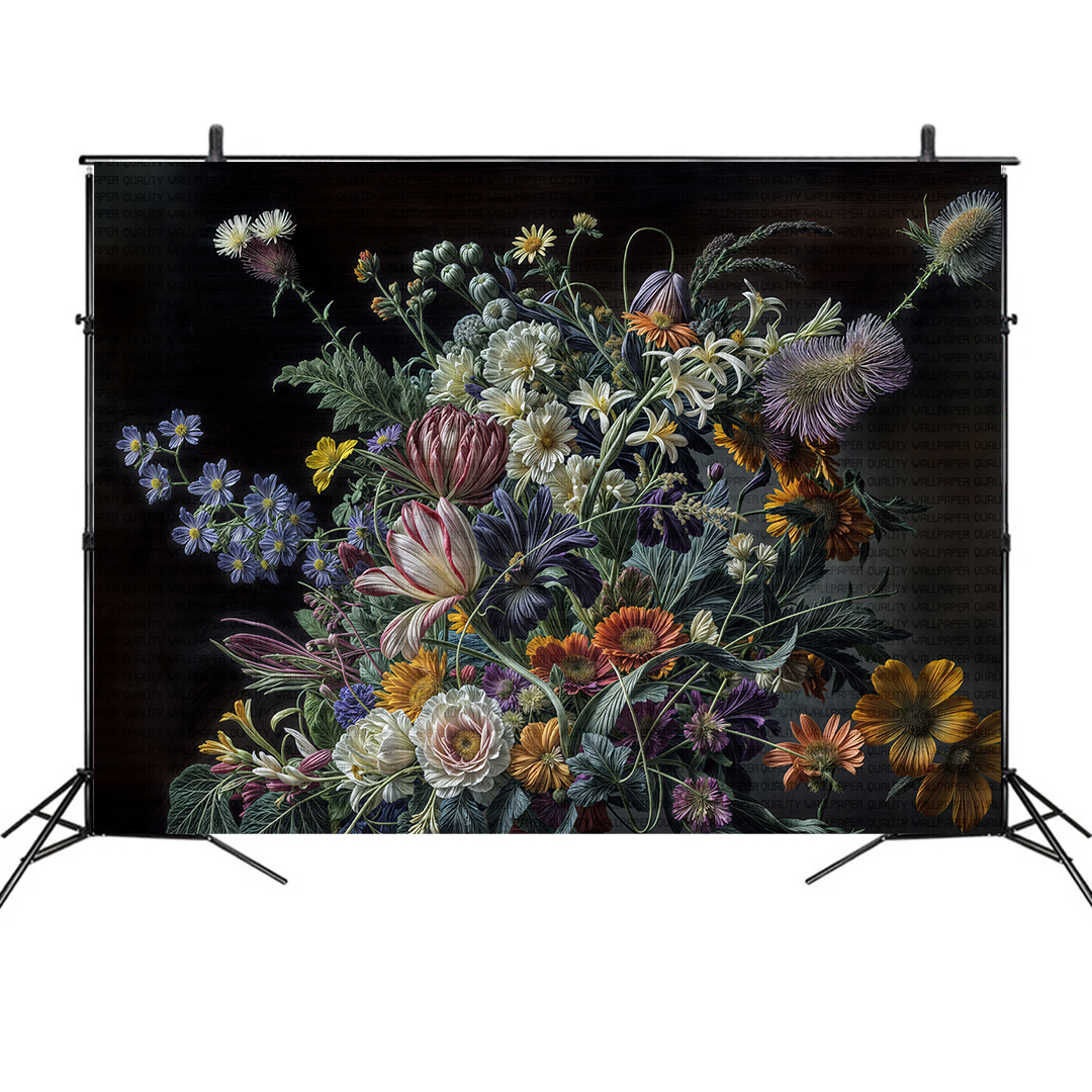 Bu tasarım, karanlık bir tuvalin üzerinde açan canlı bir renk cümbüşünü betimliyor. Çeşitli çiçeklerin bir araya geldiği bu aranjman, zengin renk paleti ve detaylı dokusuyla dikkat çekiyor. Her bir çiçek, kendine özgü şekli ve rengiyle bu cümbüşe katkıda bulunurken, yaprakların ve gölgelerin ustaca kullanımı tasarıma derinlik katıyor. Fırça darbeleri ve renklerin kontrastı, bu etkileyici ve dramatik atmosferi güçlendiriyor.