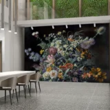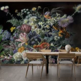 Bu tasarım, karanlık bir tuvalin üzerinde açan canlı bir renk cümbüşünü betimliyor. Çeşitli çiçeklerin bir araya geldiği bu aranjman, zengin renk paleti ve detaylı dokusuyla dikkat çekiyor. Her bir çiçek, kendine özgü şekli ve rengiyle bu cümbüşe katkıda bulunurken, yaprakların ve gölgelerin ustaca kullanımı tasarıma derinlik katıyor. Fırça darbeleri ve renklerin kontrastı, bu etkileyici ve dramatik atmosferi güçlendiriyor.