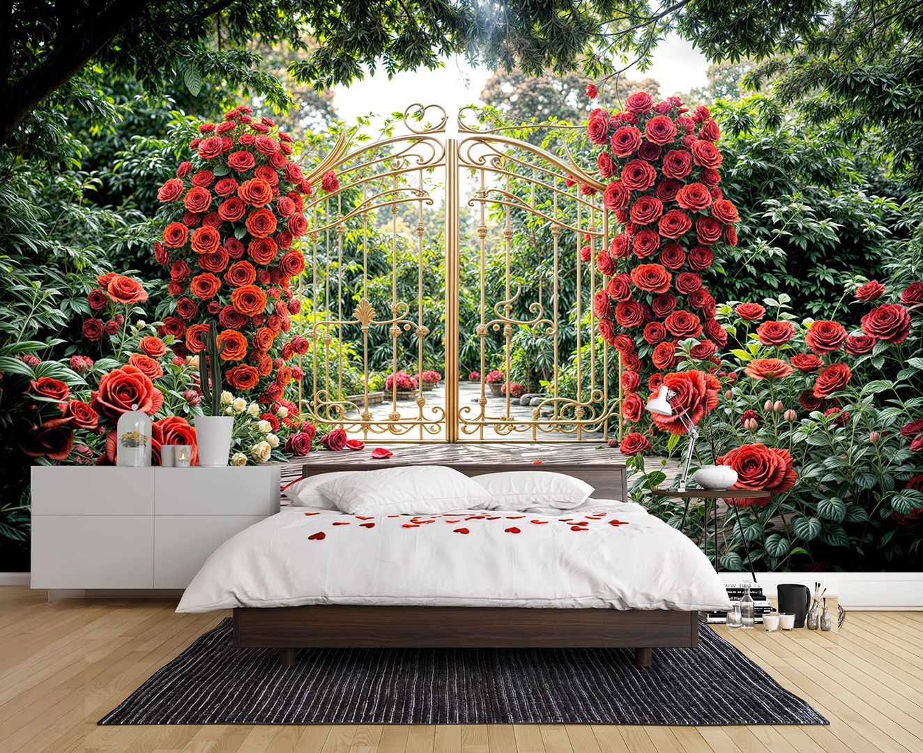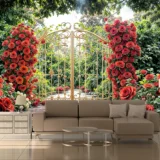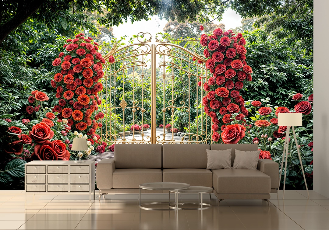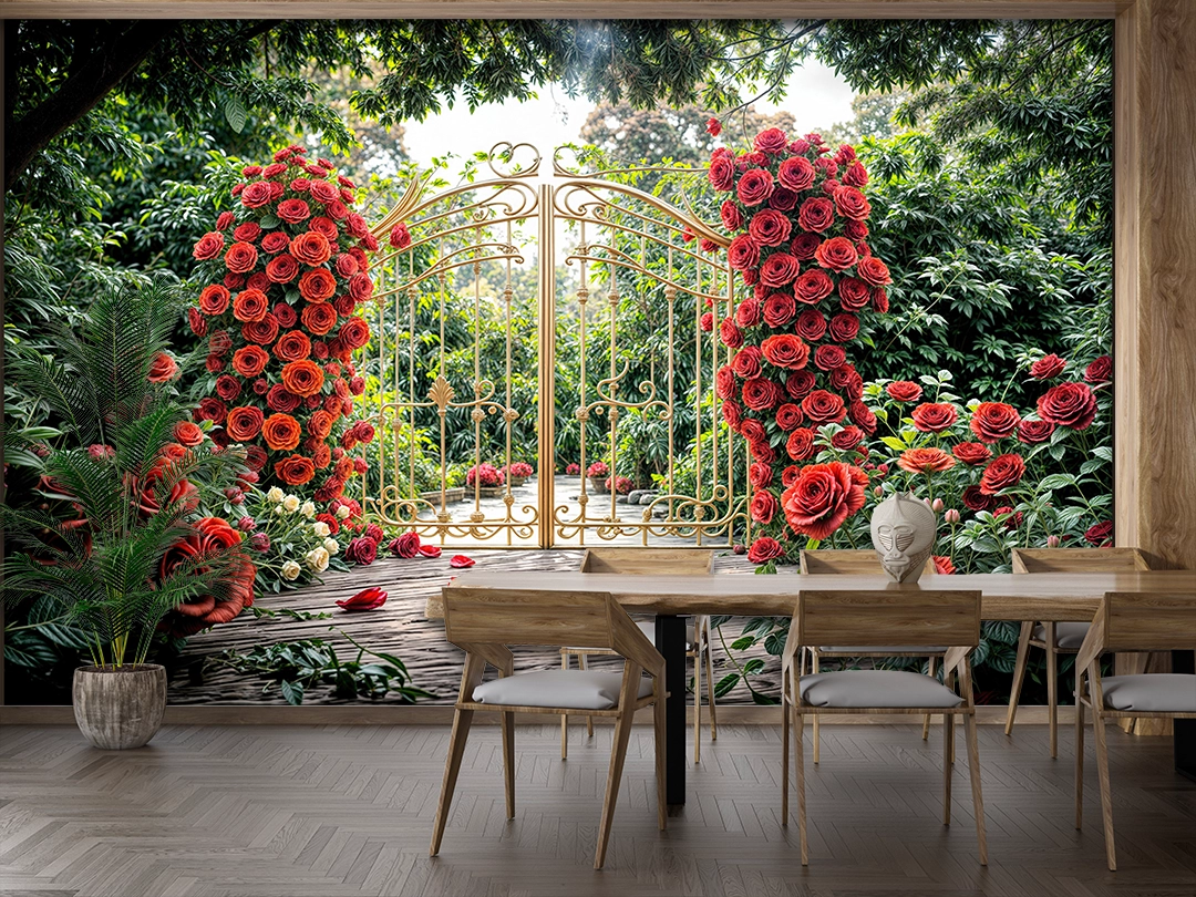 Bu tasarım, zamanda donmuş, gizemli ve romantik bir bahçenin eşiğini gözler önüne seriyor. Yemyeşil ağaçların ve çalıların arasında yükselen, binlerce canlı kırmızı gülden oluşmuş devasa sütunlarla çevrili, altın rengi işlemeli bir kapı, masalsı bir dünyaya açılan bir geçit gibi duruyor. Kapının önündeki ahşap zemin ve yere serpilmiş kırmızı gül yaprakları, bu büyülü anın atmosferini tamamlarken, yukarıdan süzülen yumuşak ışık, umudu ve yeni başlangıçları simgeliyor. Her bir fırça darbesi, güllerin kadifemsi dokusunu, altının ışıltısını ve ahşabın sıcaklığını hissettirirken, renklerin uyumu izleyicide hem huzur hem de derin bir romantizm hissi uyandırır. Bu eser, bakan herkese kendi özel anlarını hatırlatacak, mekanlara sıcaklık, gizem ve zamansız bir güzellik katacak, adeta bir rüyadan fırlamış gibi büyülü bir his bırakacaktır.