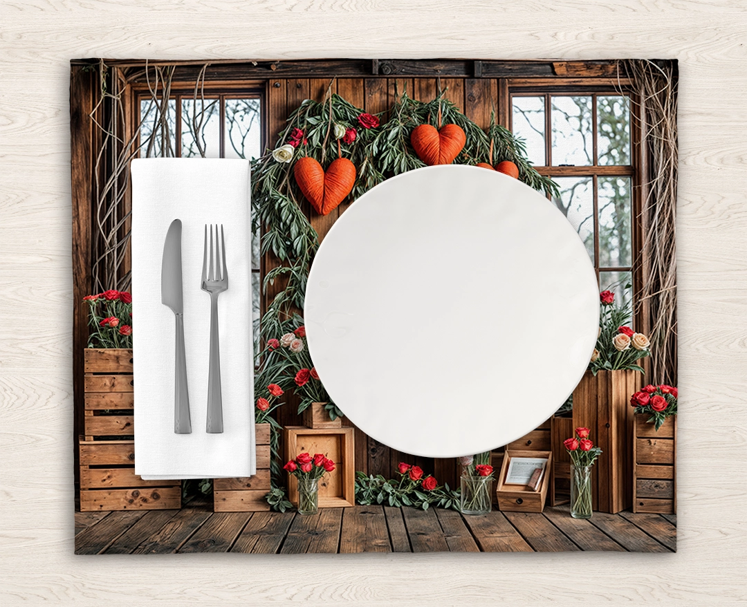 Bu tasarım, kırsal bir kış masalının sıcaklığını ve samimiyetini gözler önüne seriyor. Eski ahşap bir kulübenin içini andıran bu sahne, hem Noel’in büyüsünü hem de Sevgililer Günü’nün romantizmini bir araya getiriyor. Duvarlara asılmış büyük, tüylü kırmızı kalpler, sevginin ve bağlılığın sembolü olurken, etrafı saran yemyeşil çam dalları ve minik kırmızı meyveler, mevsimin canlılığını ve tazeliğini fısıldıyor. Ahşap kasalar, pencerelerden sızan doğal ışık ve zarif çiçek aranjmanları, bu özel anın huzurunu ve neşesini vurguluyor. Her bir fırça darbesi, ahşabın dokusunu, yaprakların narinliğini ve kalplerin yumuşaklığını hissettirirken, renklerin uyumu izleyicide hem sıcaklık hem de romantizm hissi uyandırır. Bu eser, bakan herkese özel anlarını hatırlatacak, mekanlara samimiyet ve zarafet katacak, adeta bir rüyadan fırlamış gibi büyülü bir his bırakacaktır.