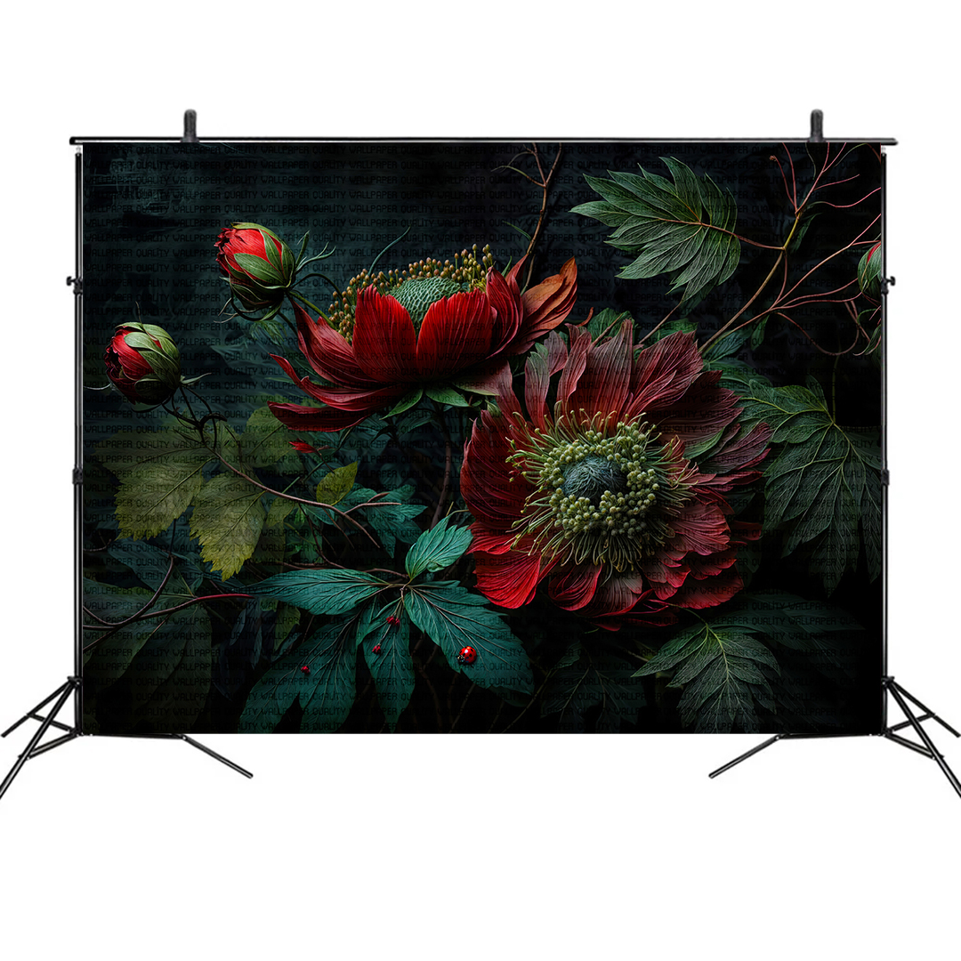 Bu tasarım, koyu bir tuval üzerinde açan canlı çiçeklerin büyüleyici senfonisini sunuyor. Her bir çiçek, derinlikli renkleri ve zarif formuyla dikkat çekerken, koyu zemin çiçeklerin canlılığını daha da belirginleştiriyor. Bu eser, mekanlara hem dramatik bir etki hem de çiçeklerin zamansız güzelliğini taşıyarak izleyicilere unutulmaz bir görsel şölen sunuyor.