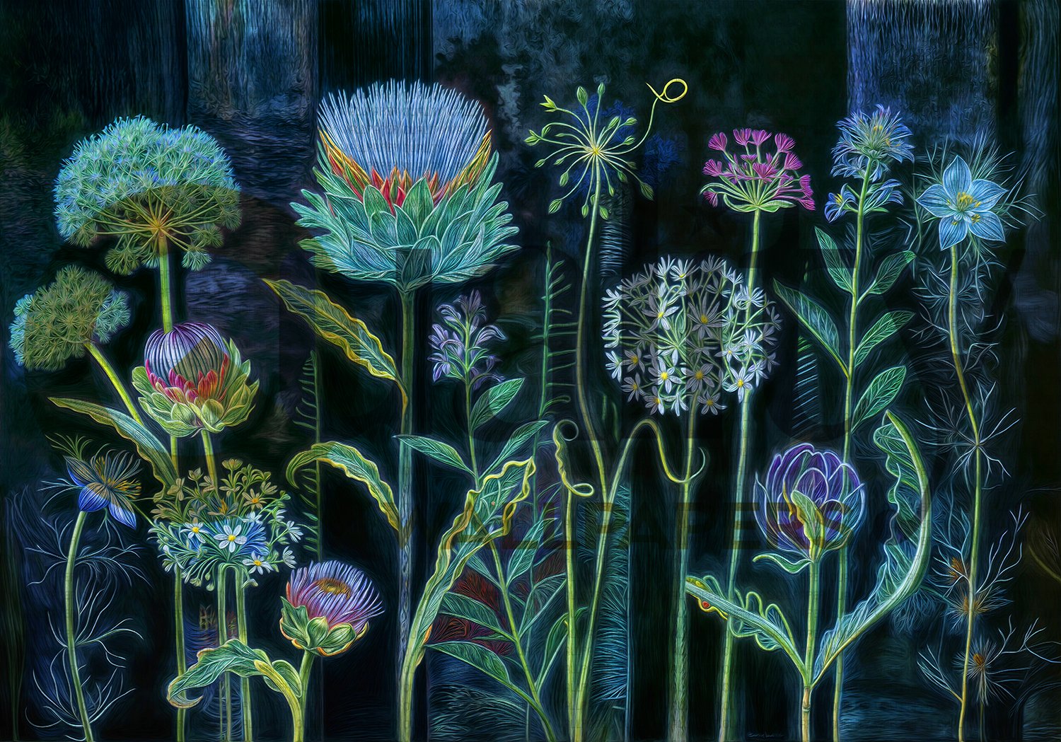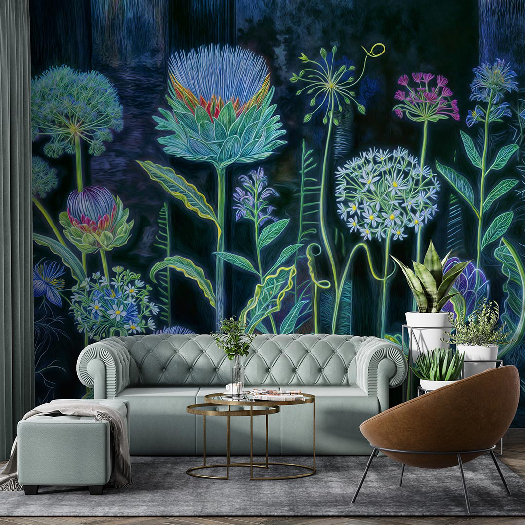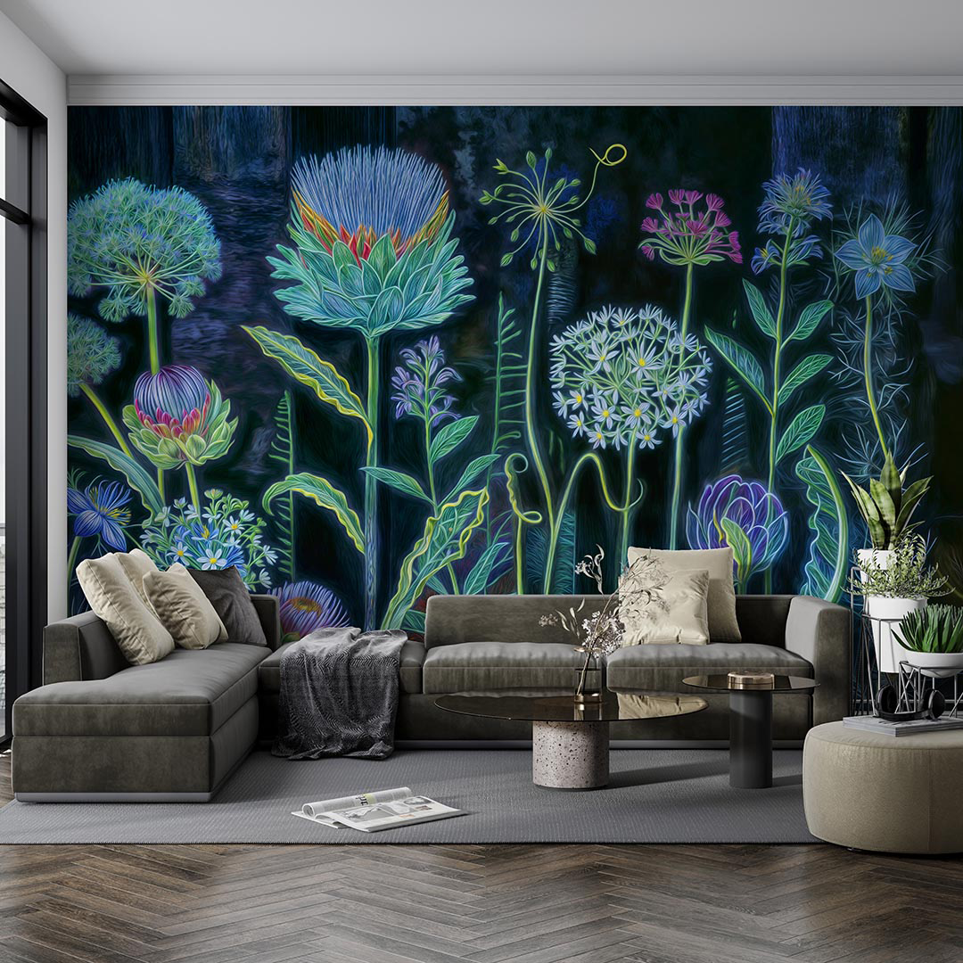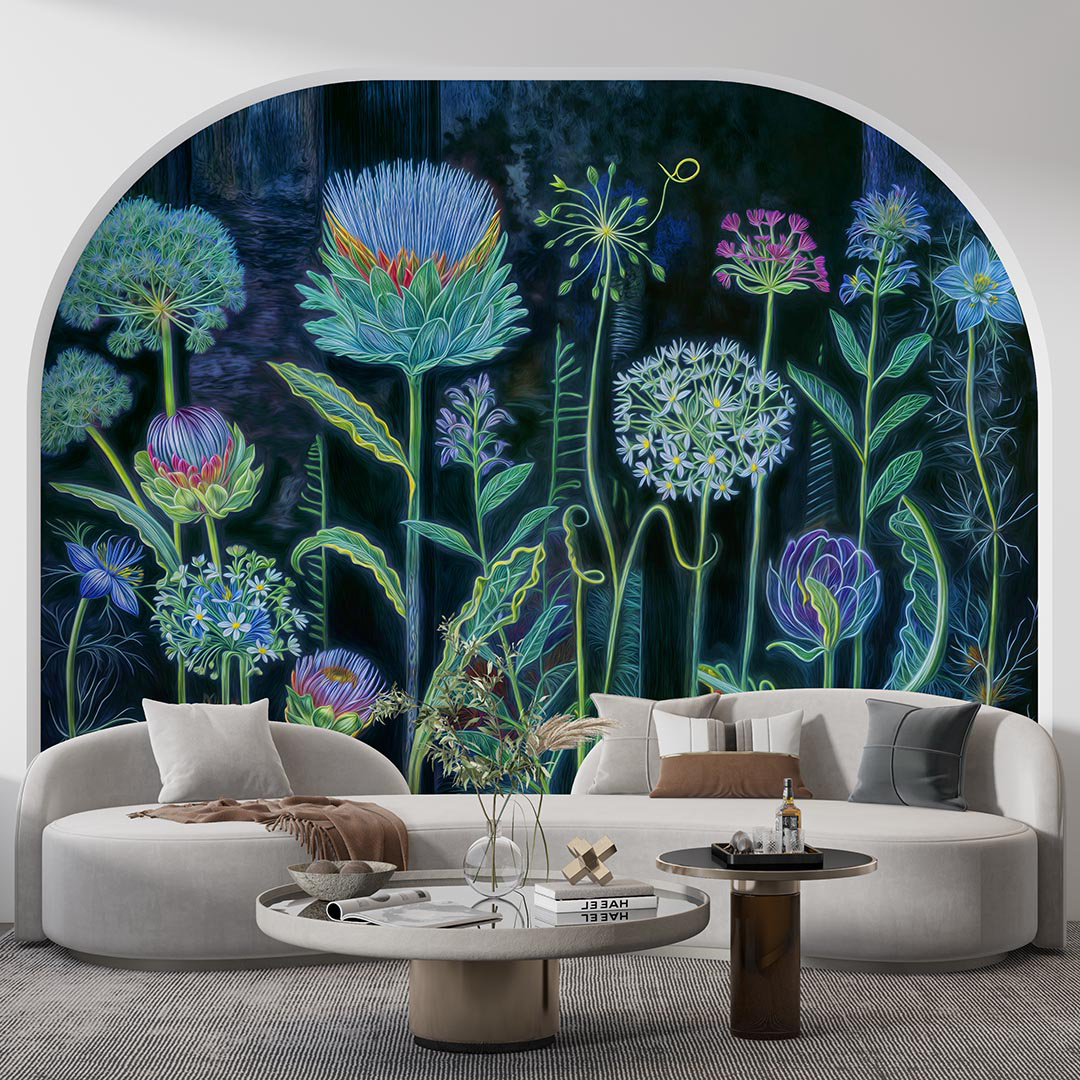 Bu büyüleyici sanat eseri, karanlık bir arka planda açan canlı renkli çiçeklerin mistik güzelliğini gözler önüne seriyor. Her bir çiçek, kendi hikayesini fısıldayan gizemli bir varlık gibi. Bu tasarım, izleyiciyi karanlığın içindeki renklere doğru bir yolculuğa çıkarıyor, onlara umudu, gizemi ve doğanın büyülü gücünü hatırlatıyor.