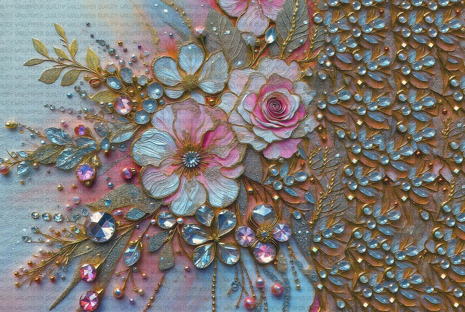Bu büyüleyici sanat eseri, ışığı her yansıttığında göz kamaştıran mücevherlerle süslenmiş bir çiçek bahçesini sunuyor. Kabartmalı çiçekler, zengin dokularıyla dikkat çekerken, her bir mücevher ışıltısıyla ortama lüks ve zarafet katıyor. Bu eser, mekanlara zengin bir atmosfer getirirken, çiçeklerin zamansız güzelliğini ve mücevherlerin ışıltısını bir araya getiriyor.