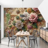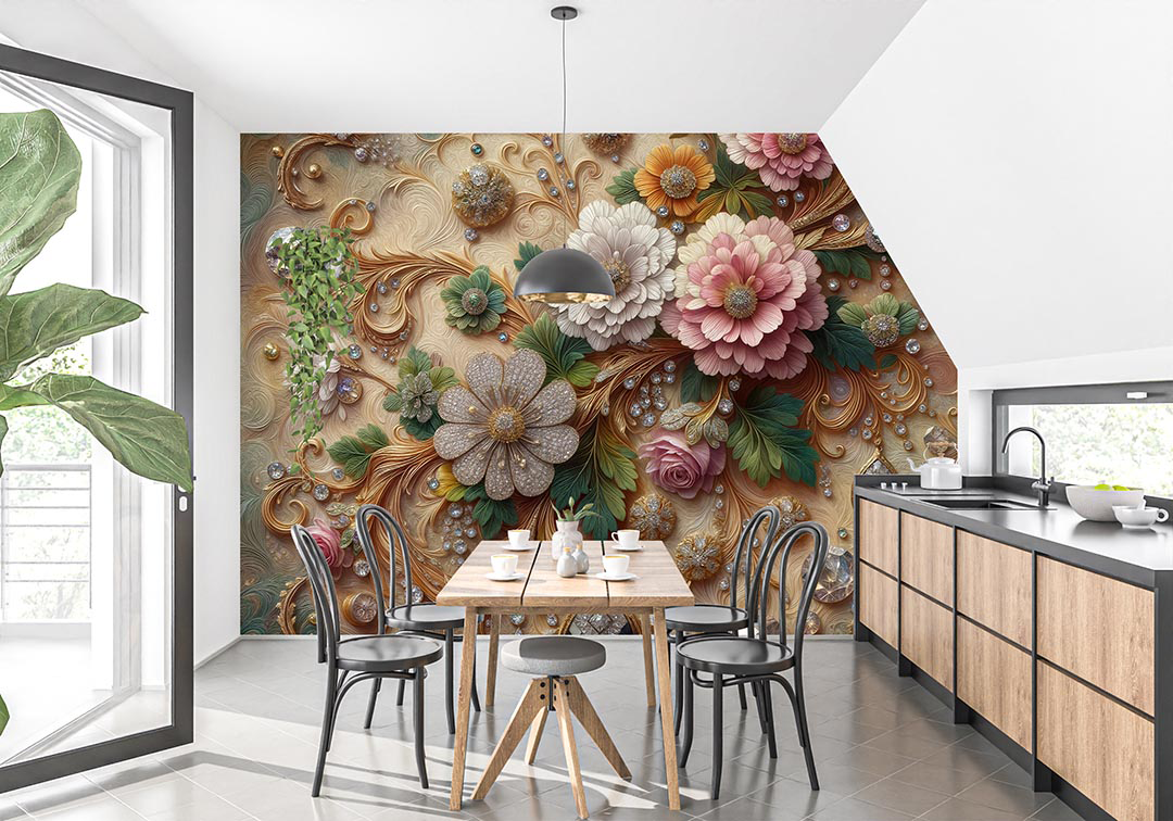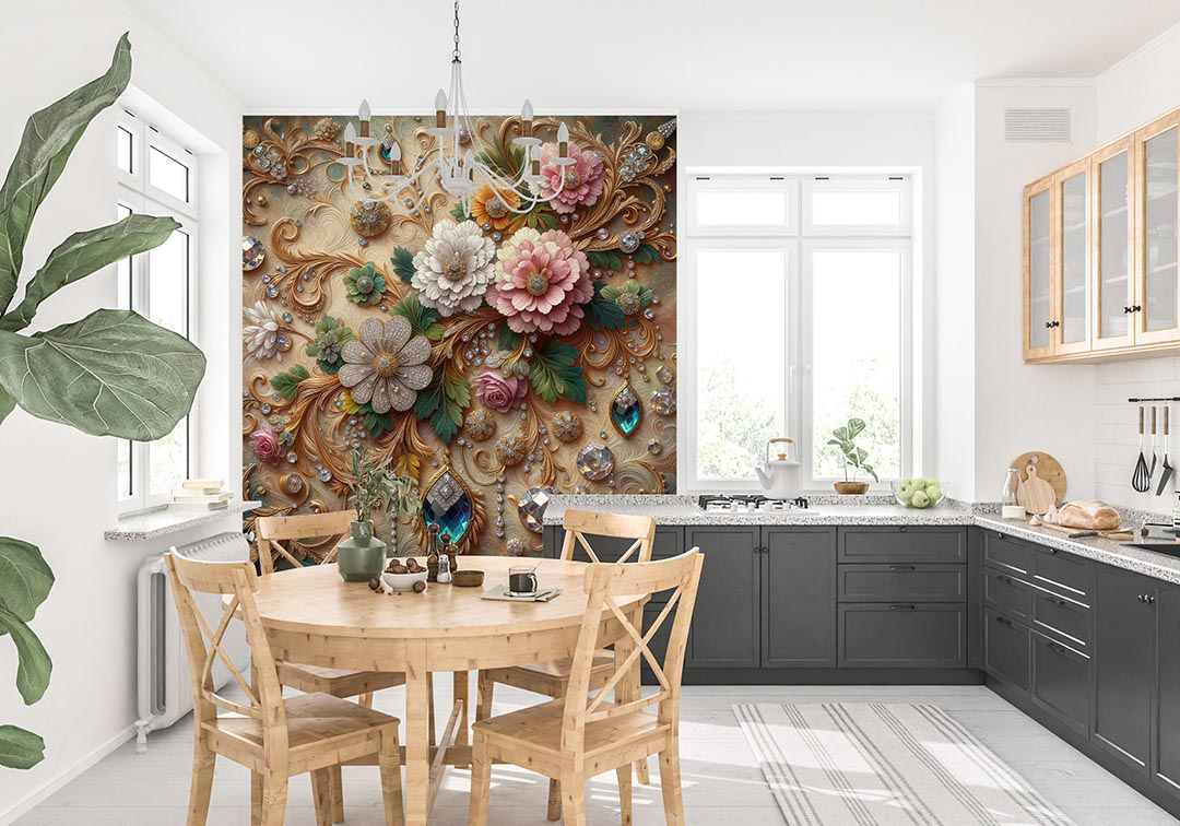 Bu büyüleyici sanat eseri, baharın gizemli güzelliğini ve zenginliğini yansıtan, mücevherlerle bezenmiş çiçeklerden oluşan bir tablo sunuyor. Her bir çiçek, değerli taşlarla süslenerek tasarıma derinlik, ışıltı ve lüks bir hava katıyor. Bu eser, mekanlara sofistike bir cazibe ve sanatsal bir dokunuş getirirken, baharın tazeliğini ve mücevherlerin göz alıcı parlaklığını bir araya getiriyor.