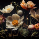 Bu tasarım, narin ve zarif çiçeklerin bir araya geldiği büyülü bir kompozisyon sunuyor. Pastel tonlardaki çiçekler, izleyiciye huzur ve sükunet dolu bir atmosfer sunuyor. Her bir çiçek, hafif ve zarif yapraklarıyla dikkat çekerken, kompozisyonun bütünü dinginlik ve zarafet hissi uyandırıyor. Fırça darbeleri ve renklerin kullanımı, bu etkileyici ve büyüleyici etkiyi güçlendiriyor.