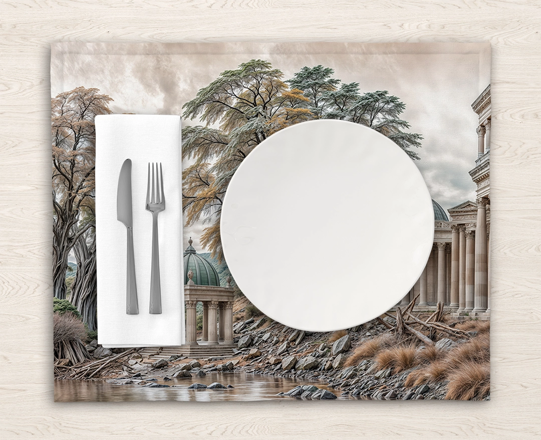 Bu tasarım, göl kenarında yükselen neoklasik yapıların ve görkemli ağaçların, zamanın ve doğanın eşsiz birleşimini fırça darbeleriyle gözler önüne seriyor. Yüksek sütunlar ve kubbeli yapılar, geçmişin ihtişamını fısıldarken, gölün dingin suları ve çevresindeki ağaçlar, manzaraya huzur ve derinlik katıyor. Her fırça darbesi, taşın dokusunu, ağaçların dallarını ve suyun hafif dalgalanmasını vurgularken, kahverenginin, grinin ve yeşilin zengin tonları, bu sahnenin dinginliğini ve mistik atmosferini hissettiriyor. İzleyicide bir hayranlık, sakinlik ve keşfetme arzusu uyandırırken, aynı zamanda tarihin ve doğanın gücüne tanık olma hissini veriyor. Bu görsel, ruhu dinlendiren, hayal gücünü harekete geçiren ve sizi zamansız bir yolculuğa davet eden bir kapı aralıyor.