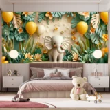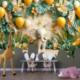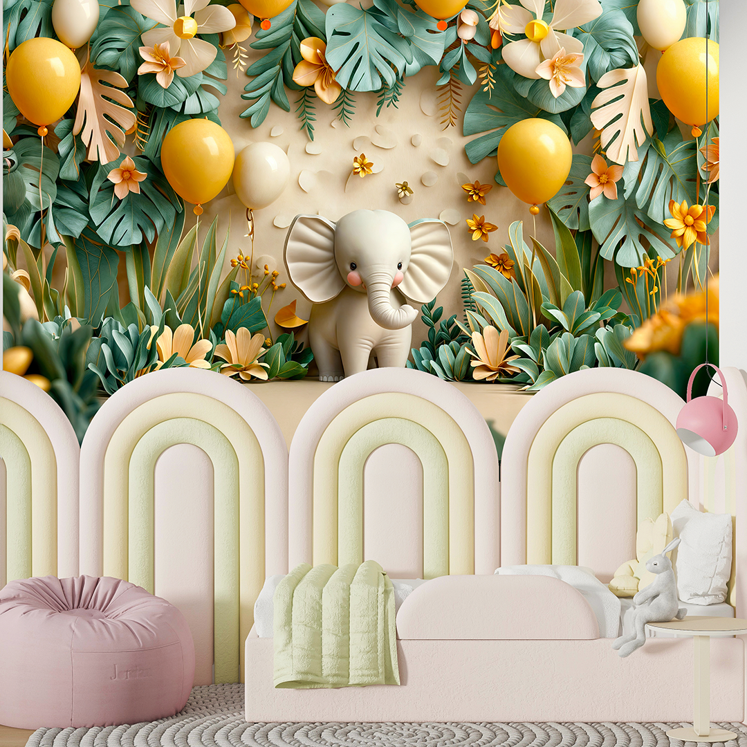 Bu büyüleyici tasarım, sevimli bir filin tropik bir bahçede rengarenk balonlarla çevrili neşeli anını yakalıyor. Canlı renkler ve tropik bitkiler, sahneye neşeli ve enerjik bir hava katarken, filin sevimli duruşu izleyicilere mutluluk veriyor. Fırça darbeleri, balonların hafifliğini ve bahçenin canlılığını vurgulayarak, hayallerin ve neşenin bir araya geldiği bir dünya sunuyor.