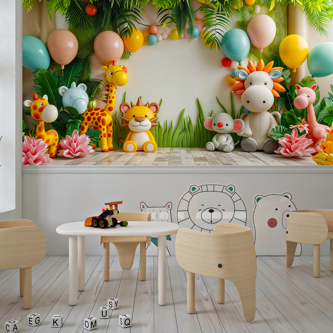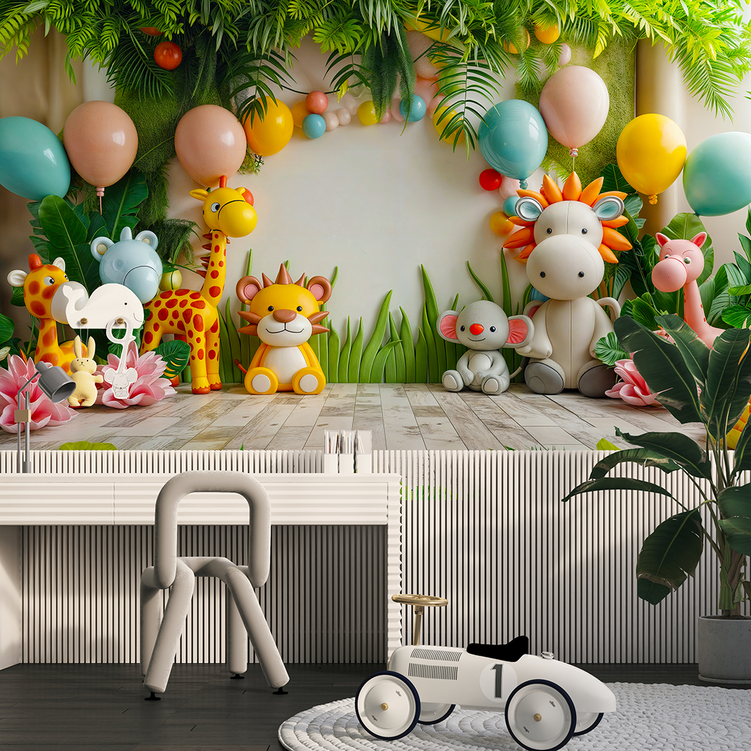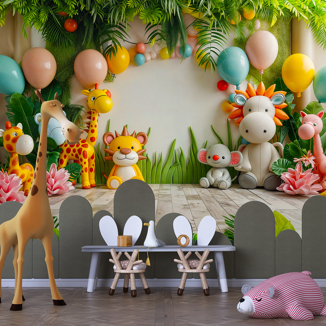 Bu canlı ve neşeli tasarım, sevimli oyuncak hayvanların rengarenk balonlarla dolu bir kutlama sahnesini betimliyor. Zürafalar, aslan, koala ve diğer dostlarımız, balonlarla çevrili bu mutlu anda bir araya gelerek izleyicilere coşku ve eğlence dolu bir hikaye sunuyor. Sıcak renkler ve sevimli detaylar, bu sahneyi çocuksu bir hayal gücüyle zenginleştirirken, balonların kattığı şenlik havası neşeli bir atmosfer yaratıyor. Bu eser, dostluğun ve kutlamanın getirdiği mutluluğu yansıtıyor.