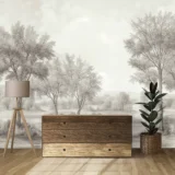 Bu tasarım, ormanın sakin ve huzurlu yüzünü yansıtıyor. Yumuşak renklerin pastel tonları, ormanın dingin atmosferini vurgularken, ağaçların sessizliği mekana huzurlu bir zarafet katıyor. Her detay, ormanın puslu şarkısını ve dingin güzelliğini yansıtarak duvarlarınıza sanatsal bir dokunuş sunuyor. Bu eser, yaşam alanlarınıza hem doğal bir huzur hem de zarif bir estetik katıyor.