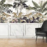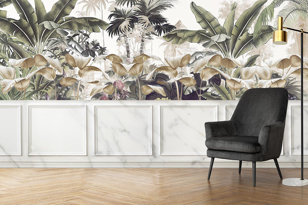 Bu tasarım, tropik bir bahçenin gizemli ve çekici atmosferini yansıtıyor. Sulu boya tekniğiyle resmedilmiş palmiye ağaçları ve egzotik çiçekler, tropik esintinin mistik ve büyüleyici yönünü mekanlara taşıyor. Bu eser, tropik bahçenin zenginliğini ve gizemini hissettirerek, kullanıcısına büyüleyici bir atmosfer sunuyor.