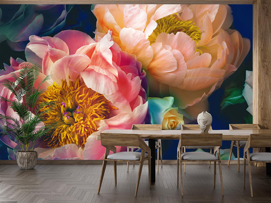 Bu görsel, pembe şakayıkların büyüleyici güzelliğini ve zarafetini yansıtıyor. Canlı pembe tonları ve narin yapraklarıyla şakayıklar, baharın en güzel yansıması olarak karşımıza çıkıyor. Bu tasarım, mekanlara romantik ve zarif bir hava katarken, doğanın benzersiz güzelliğini de gözler önüne seriyor.