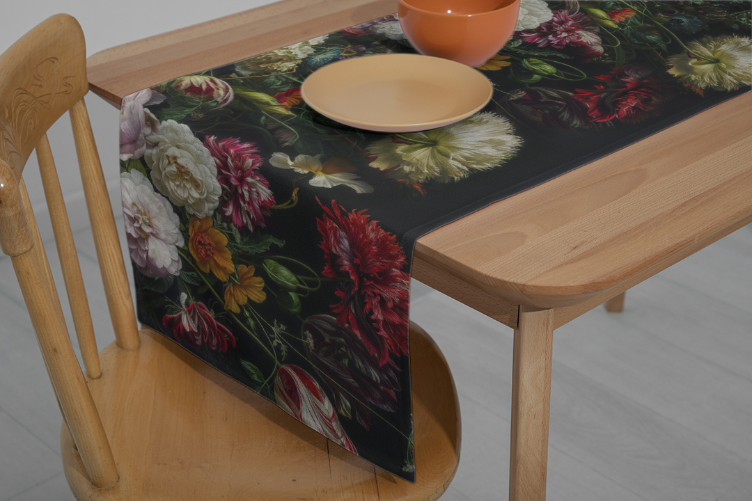 Bu tasarım, Rönesans döneminin zenginliğini ve gizemini yansıtan koyu renkli bir çiçek bahçesini sunuyor. Koyu kırmızı, bordo ve mor tonlarının hakim olduğu çiçekler, izleyiciye tarihi bir derinlik ve sanatsal bir şölen sunuyor. Her bir çiçek, detaylı dokusu ve zengin renkleriyle dikkat çekerken, kompozisyonun bütünü dramatik ve etkileyici bir atmosfer yaratıyor. Fırça darbeleri ve renklerin kullanımı, bu tarihi ve sanatsal etkiyi güçlendiriyor.