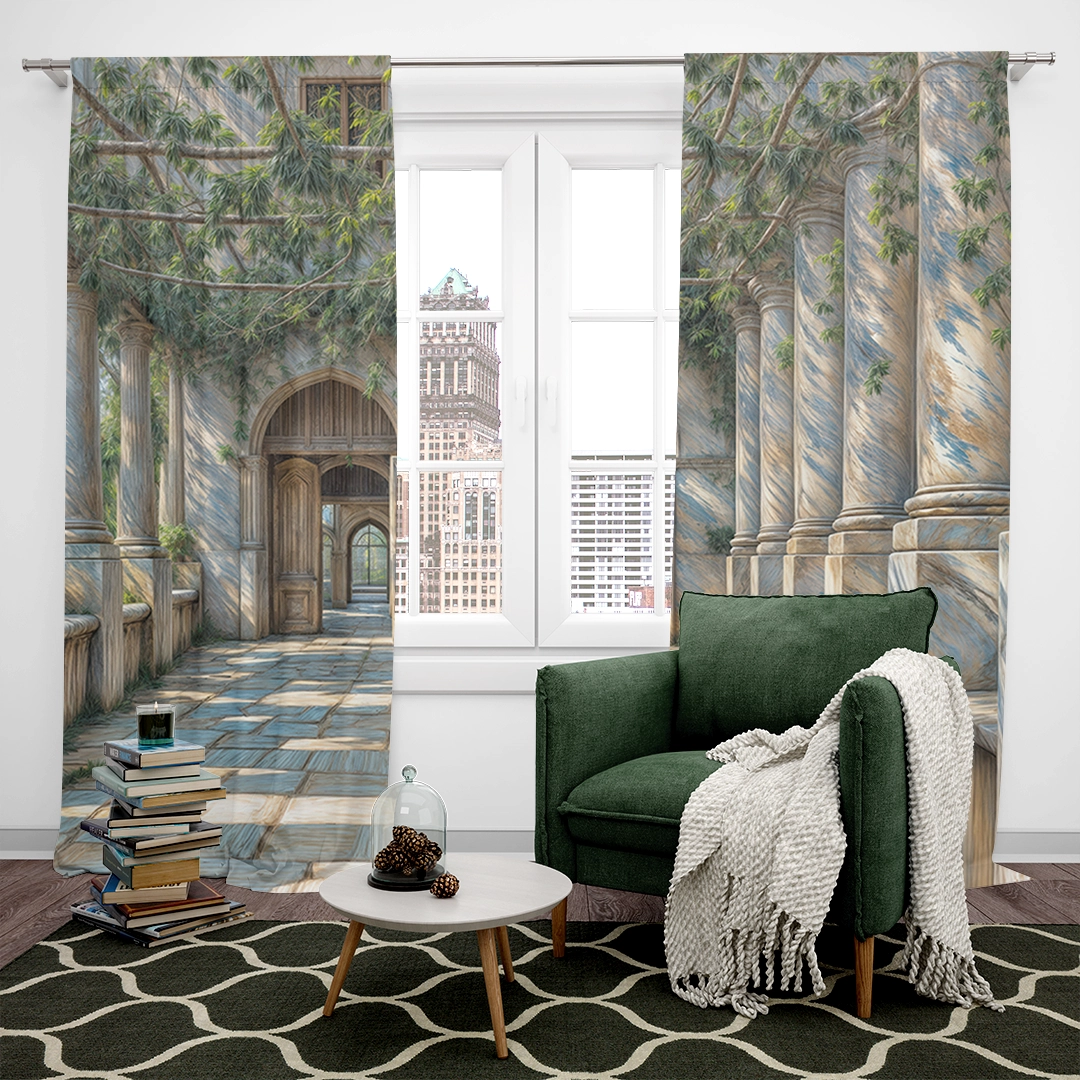 Bu tasarım, “Soul Calibur 2” oyunundaki bir sahneden ilham alan, antik bir koridorun büyüleyici ve mistik atmosferini fırça darbeleriyle gözler önüne seriyor. Yemyeşil sarmaşıklarla kaplı mermer sütunlar ve taş döşemeler, geçmişin ihtişamını ve kadim bir medeniyetin sırlarını fısıldıyor. Güneş ışınlarının sütunlar arasından süzülerek zeminde oluşturduğu gölgeler, mekana derinlik ve dramatik bir hava katıyor. Her fırça darbesi, mermerin dokusunu, bitki örtüsünün canlılığını ve ışığın oyununu vurgularken, bejin, yeşilin ve kahverenginin zengin tonları, bu sahnenin huzurunu ve büyüsünü hissettiriyor. İzleyicide bir hayranlık, sakinlik ve keşfetme arzusu uyandırırken, aynı zamanda fantastik bir dünyanın kapılarını aralama hissini veriyor. Bu görsel, ruhu dinlendiren, hayal gücünü harekete geçiren ve sizi zamansız bir yolculuğa davet eden bir kapı aralıyor