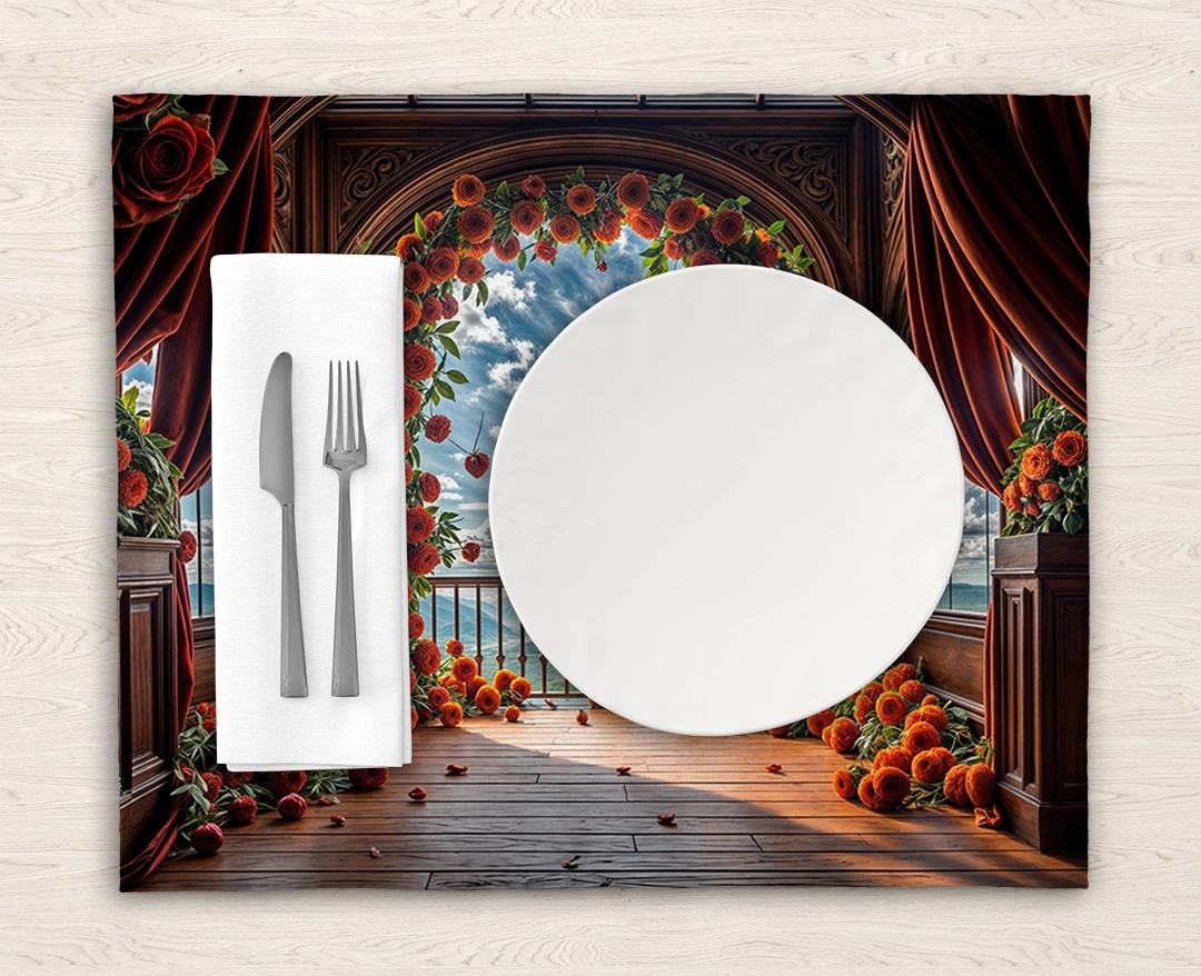 Bu tasarım, aşkın ve romantizmin doruklarda yaşandığı, adeta bir rüyadan fırlamış gibi büyülü bir düğün stüdyosu fonunu gözler önüne seriyor. Geniş bir kemer, binlerce taze kırmızı gül ve küçük kırmızı kalplerle bezenmiş, gökyüzünün ve uzak dağların nefes kesen manzarasına açılıyor. Kemerin etrafını saran zengin kırmızı perdeler, sahneye derinlik ve dram katarken, ahşap zemin ve korkuluklar, sıcak ve davetkar bir atmosfer yaratıyor. Her bir fırça darbesi, bu özel anın heyecanını, renklerin dansı ise tutkuyu ve sonsuz sevgiyi fısıldıyor. Bu eser, izleyicide hem hayranlık hem de derin bir romantizm hissi uyandırır. Düğünler, nişan törenleri, evlilik teklifleri veya özel yıldönümleri gibi hayatın en değerli anlarını ölümsüzleştirmek için tasarlanmıştır.