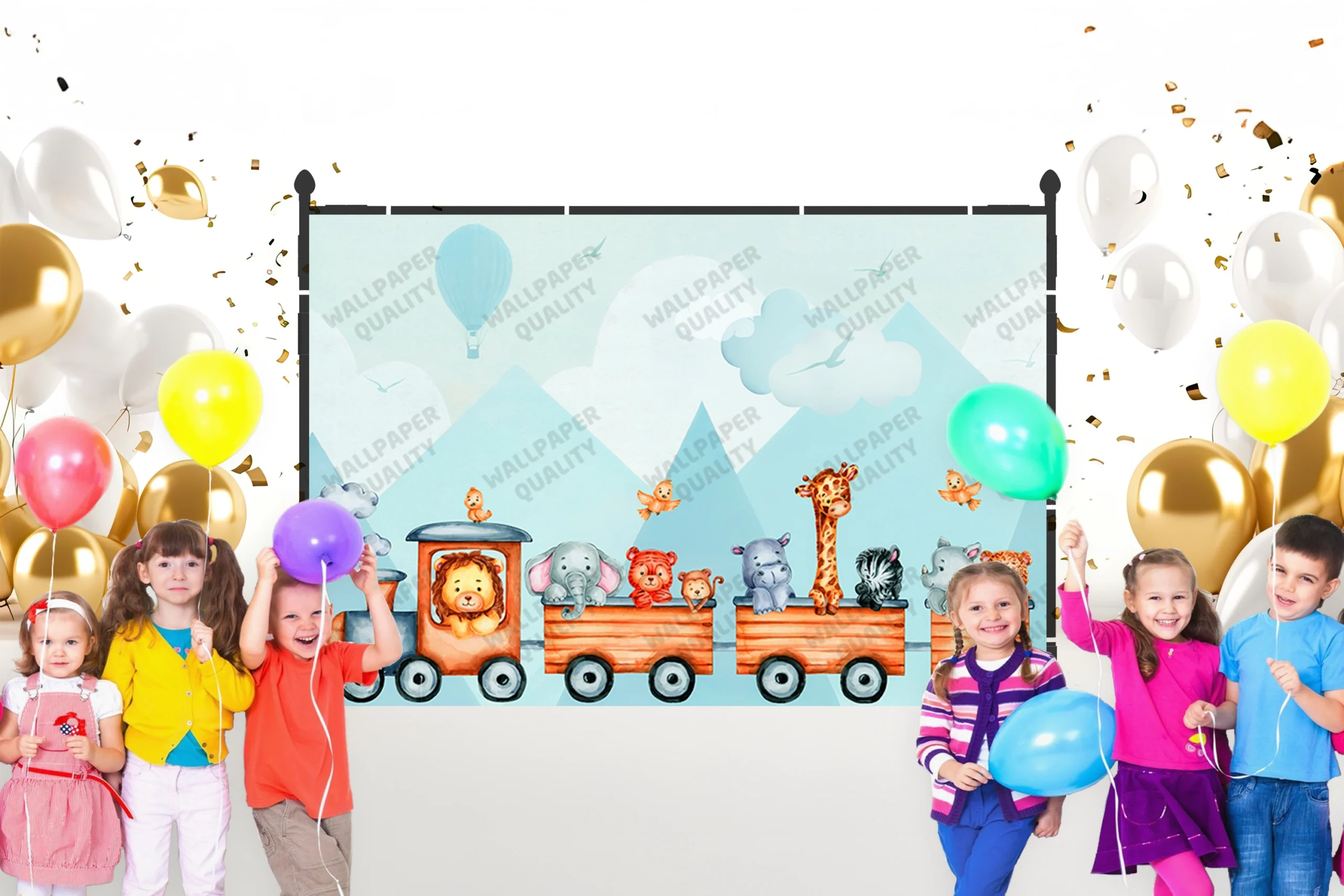 Bu eğlenceli duvar kağıdı, bir tren vagonunda yolculuk eden sevimli hayvanları konu alıyor. Kaplan, fil, zürafa gibi çeşitli hayvanlar, rengarenk balonlar ve uçan kuşlarla süslenmiş bu tasarım, çocukların hayal dünyasına neşeli bir yolculuk sunuyor. Pastel tonlar ve sevimli çizimler, huzurlu ve mutlu bir atmosfer yaratıyor.
