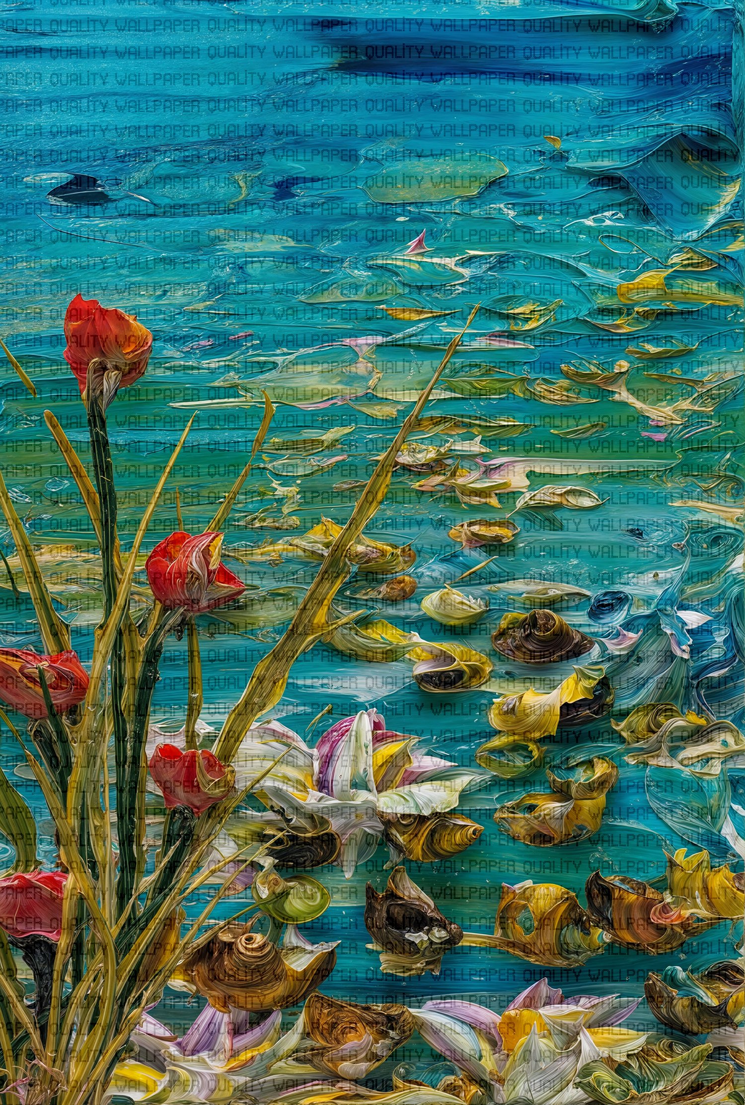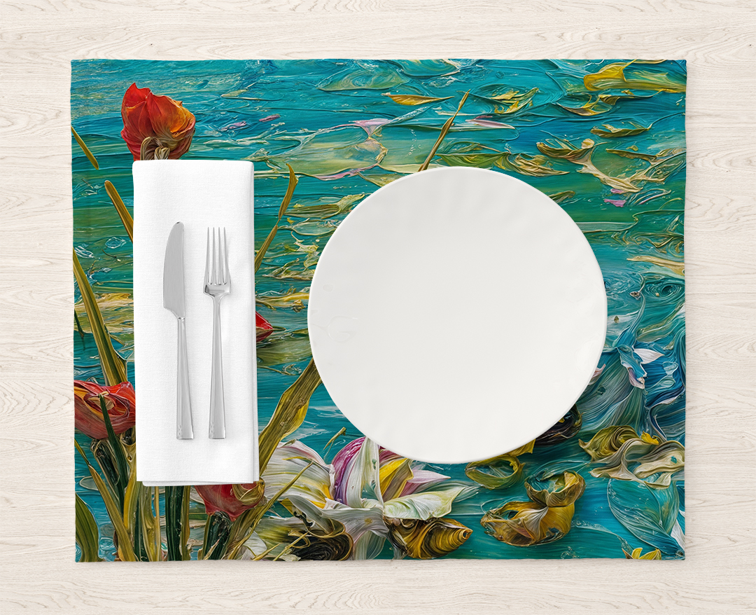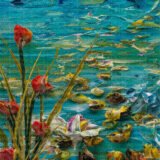 Bu tablo, suyun dinginliğini ve içindeki yaşamın canlılığını bir araya getiriyor. Yansıyan çiçekler ve suyun içinde yüzen balıklar, izleyiciye huzurlu bir an sunuyor. Renklerin canlılığı ve suyun hareketi, doğanın dinamizmini ve estetiğini yansıtıyor. Bu eser, mekanlara sakinlik ve doğal bir güzellik katarken, izleyicisine suyun ve yaşamın ritmini hissettiriyor.
