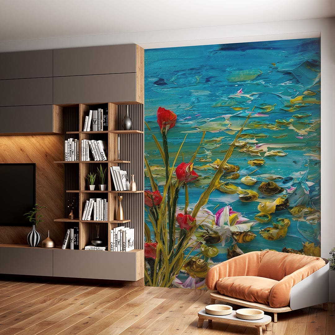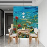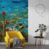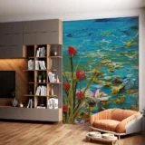 Bu tablo, suyun dinginliğini ve içindeki yaşamın canlılığını bir araya getiriyor. Yansıyan çiçekler ve suyun içinde yüzen balıklar, izleyiciye huzurlu bir an sunuyor. Renklerin canlılığı ve suyun hareketi, doğanın dinamizmini ve estetiğini yansıtıyor. Bu eser, mekanlara sakinlik ve doğal bir güzellik katarken, izleyicisine suyun ve yaşamın ritmini hissettiriyor.