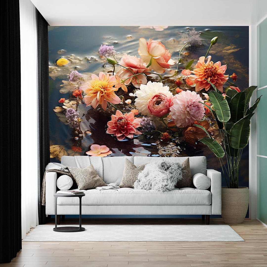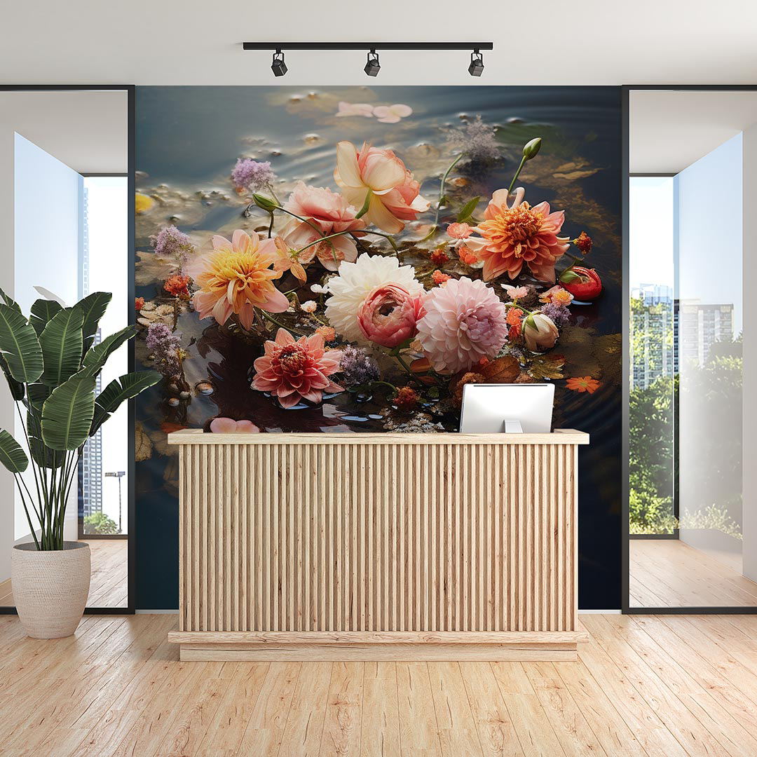 Bu tasarım, suyun dinginliği ile çiçeklerin canlılığını bir araya getiriyor. Yansıyan çiçekler, suyun üzerinde dans edercesine bir görüntü oluştururken, renklerin ve ışığın uyumu izleyiciyi büyülü bir dünyaya davet ediyor. Bu eser, doğanın huzur veren güzelliğini ve suyun yansımalarındaki gizemi bir araya getirerek mekana sakinlik ve zarafet katıyor.