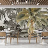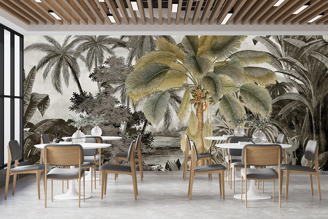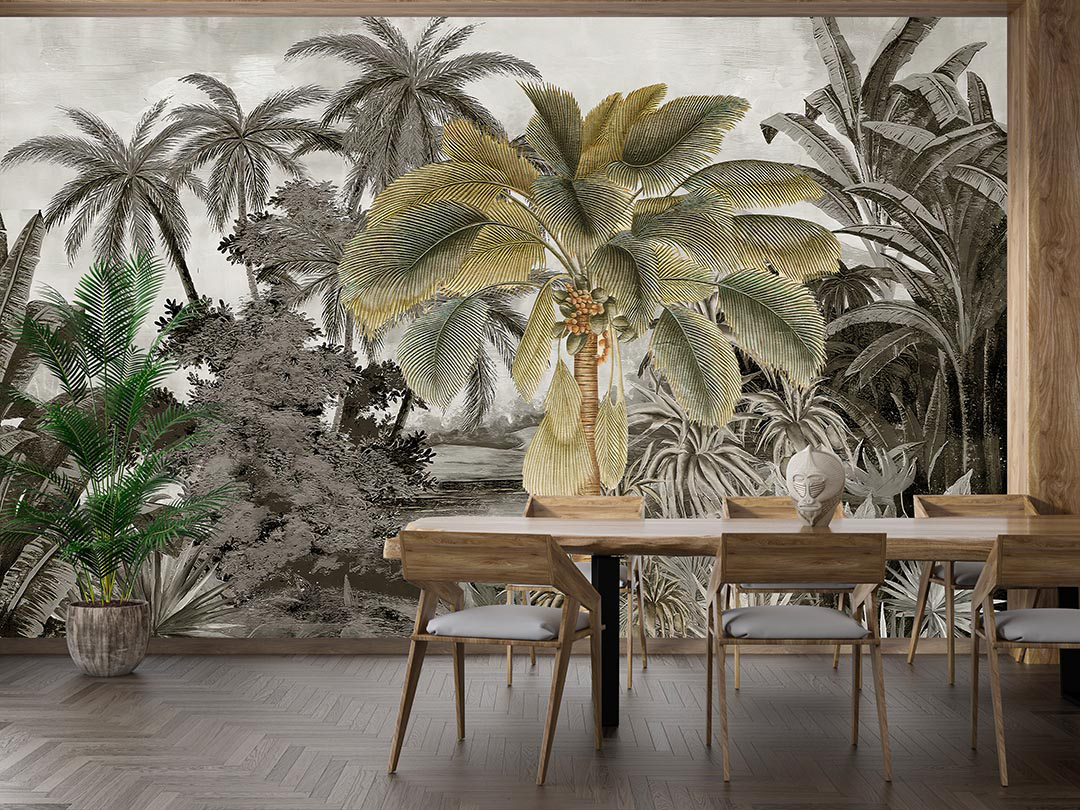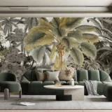 Bu tasarım, tropik bir ormanın gizemli ve büyüleyici atmosferini yansıtıyor. Yemyeşil palmiye ağaçları, derin gölge oyunları ve zengin yeşil tonları, izleyiciyi tropikal ormanın kalbine götürüyor. Her detay, tropik ormanın gizemini ve büyüleyici atmosferini yansıtarak mekanınıza hem doğal bir zarafet hem de egzotik bir cazibe katıyor. Bu eser, yaşam alanlarınıza tropik bir ormanın kapılarını aralıyor.