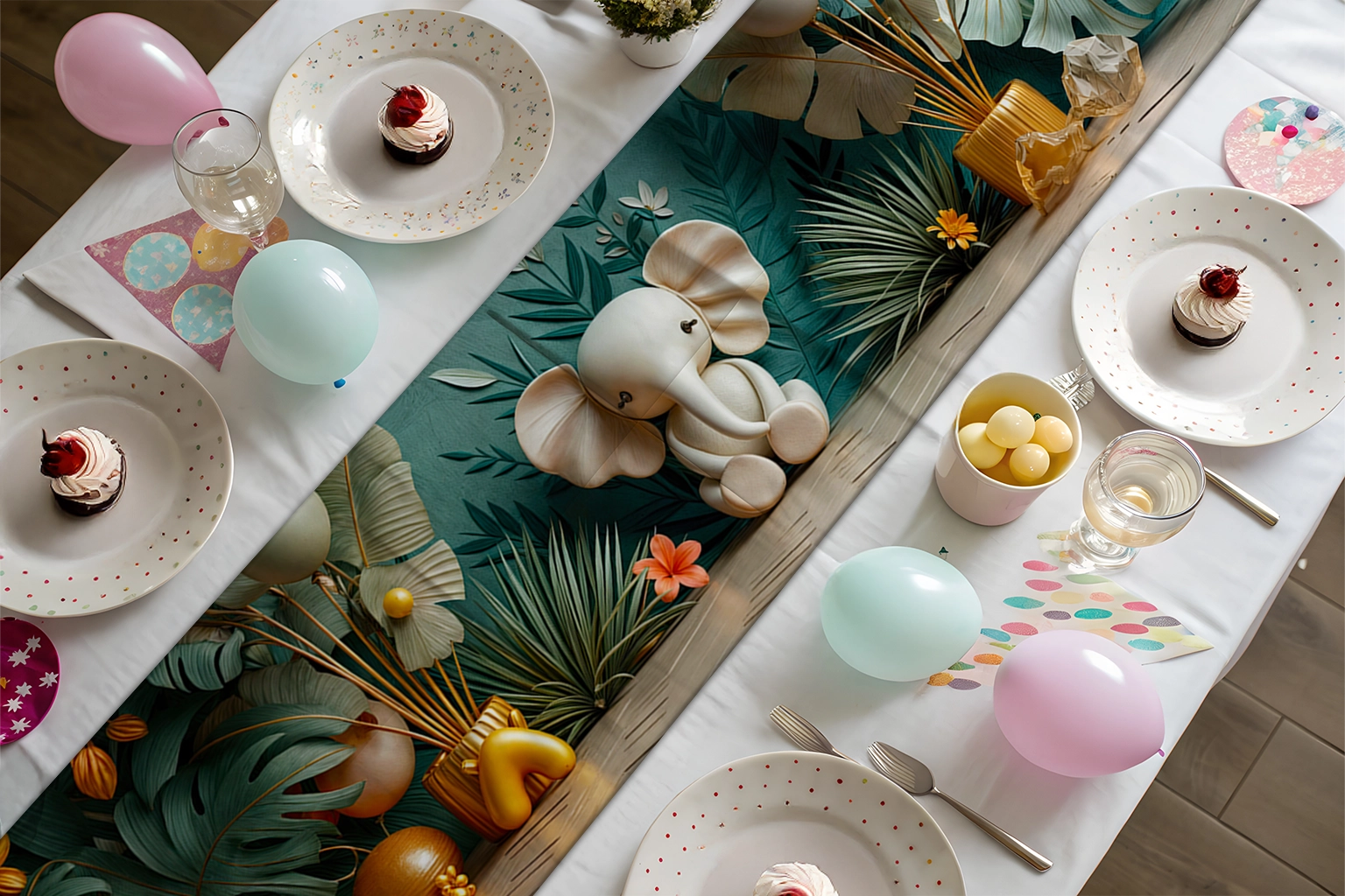 Bu sevimli görselde, tropik bir bahçenin ortasında, neşeyle poz veren bir yavru fil yer alıyor. Canlı renkler ve tropik bitkiler, sahneye enerjik ve eğlenceli bir hava katarken, filin masumiyeti ve tatlılığı izleyicilere mutluluk ve huzur veriyor. Bu tasarım, doğanın canlılığını ve yavru bir filin neşesini bir araya getirerek içsel bir yolculuğa çıkarıyor.