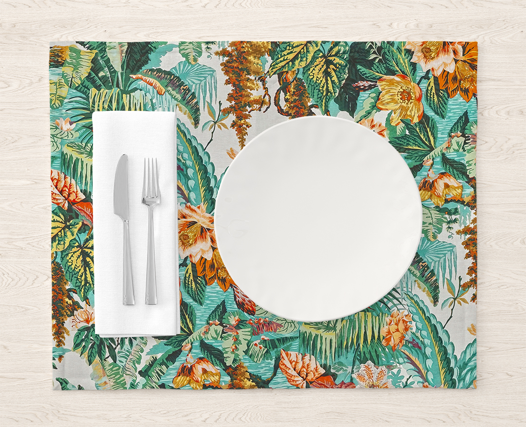 Bu tasarım, tropik bir bahçenin canlı renklerini ve zengin dokusunu bir araya getiriyor. Yeşil yapraklar arasında saklanan turuncu ve sarı çiçekler, egzotik bir atmosfer yaratıyor. Bu desen, doğanın enerjisini ve çeşitliliğini yansıtan bir tablo sunuyor. Tropik esintileri ve renkleri ile mekanlara sıcaklık ve canlılık katıyor.