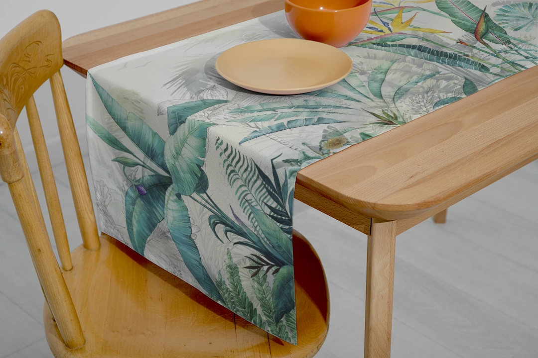 • Runner: Uzun bir masanın ortasına yerleştirildiğinde, tropik ormanın renklerini ve desenlerini yansıtır. Yemeklerinize doğal bir zarafet ve canlılık katar.