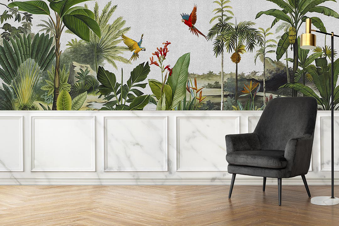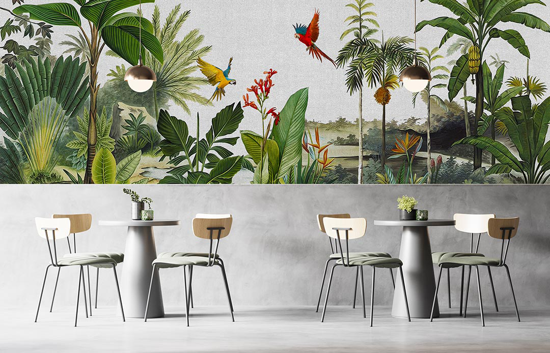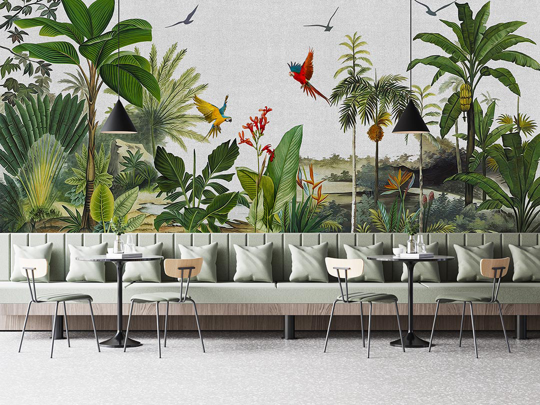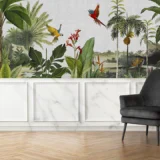 Bu tasarım, tropik bir ormanın derinliklerindeki huzuru ve gizemi yansıtır. Uçan kuşlar, egzotik bitkiler ve ormanın mistik atmosferi, doğanın büyüleyici güzelliğini bir araya getirir. Fırça darbeleri, kuşların özgürlüğünü, bitkilerin canlı renklerini ve ormanın sakin ritmini yakalar. Bu eser, izleyiciyi tropik bir dünyaya davet ederek, doğanın huzurlu şarkısını ve büyüleyici atmosferini hissettirir.