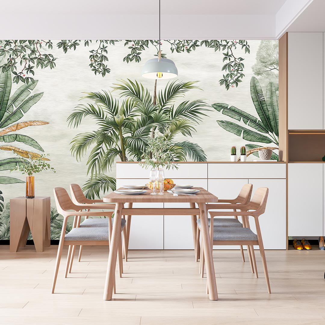 Bu tasarım, tropik ormanın kalbinden gelen huzuru ve yeşil yaprakların dansını yansıtıyor. Yaprakların canlı tonları ve doğal formları, mekana tazelik ve dinginlik katarken, ormanın mistik atmosferi ise ortama büyüleyici bir hava katıyor. Bu eser, yaşam alanlarına hem doğanın huzurunu hem de tropik ormanın enerjisini taşıyor.