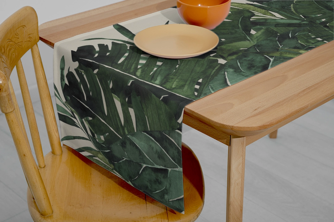 • Runner: Uzun bir masanın ortasına yerleştirildiğinde, yeşil yaprakların dinamik desenlerini sergiler. Yemeklerinize hem görsel bir şölen hem de egzotik bir zarafet katar.